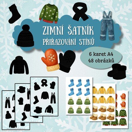 6 podkladových karet (A4) – každá karta obsahuje 8 stínů zimního oblečení, které jsou na listech různě přeházené (každé dítě má unikátní list).