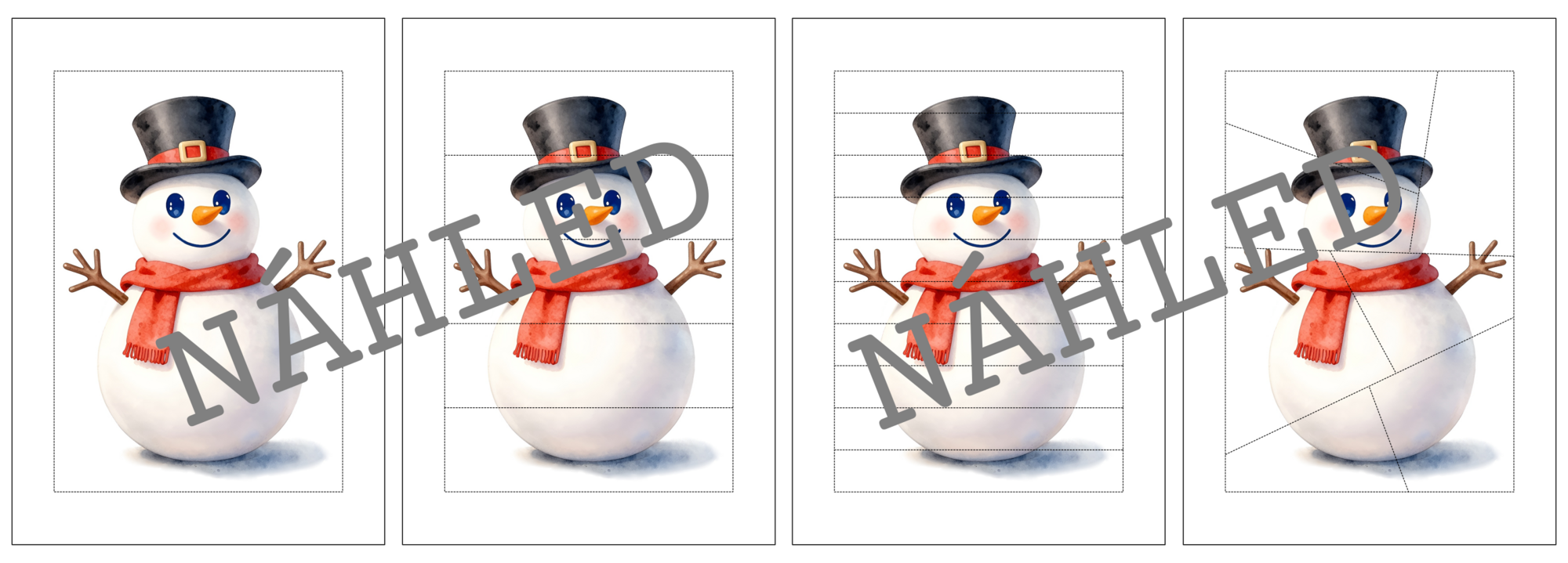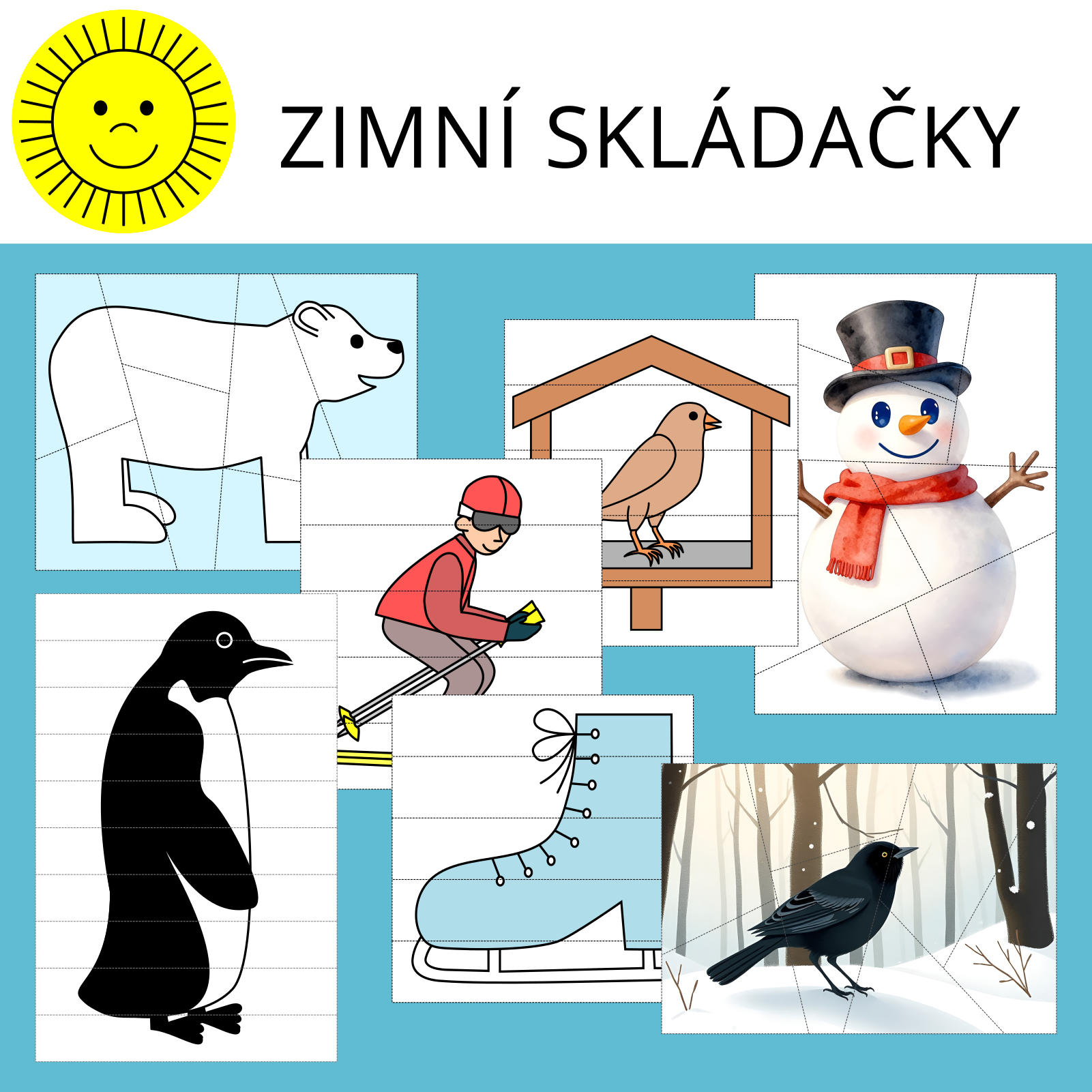 Materiál obsahuje zimní skládačky. Ke každému ze sedmi náhledových obrázků (sněhulák, brusle, lyžař, krmítko s ptákem, pták v zimě, tučňák, lední medvěd) jsou vytvořeny tři různě obtížné verze skládačky.