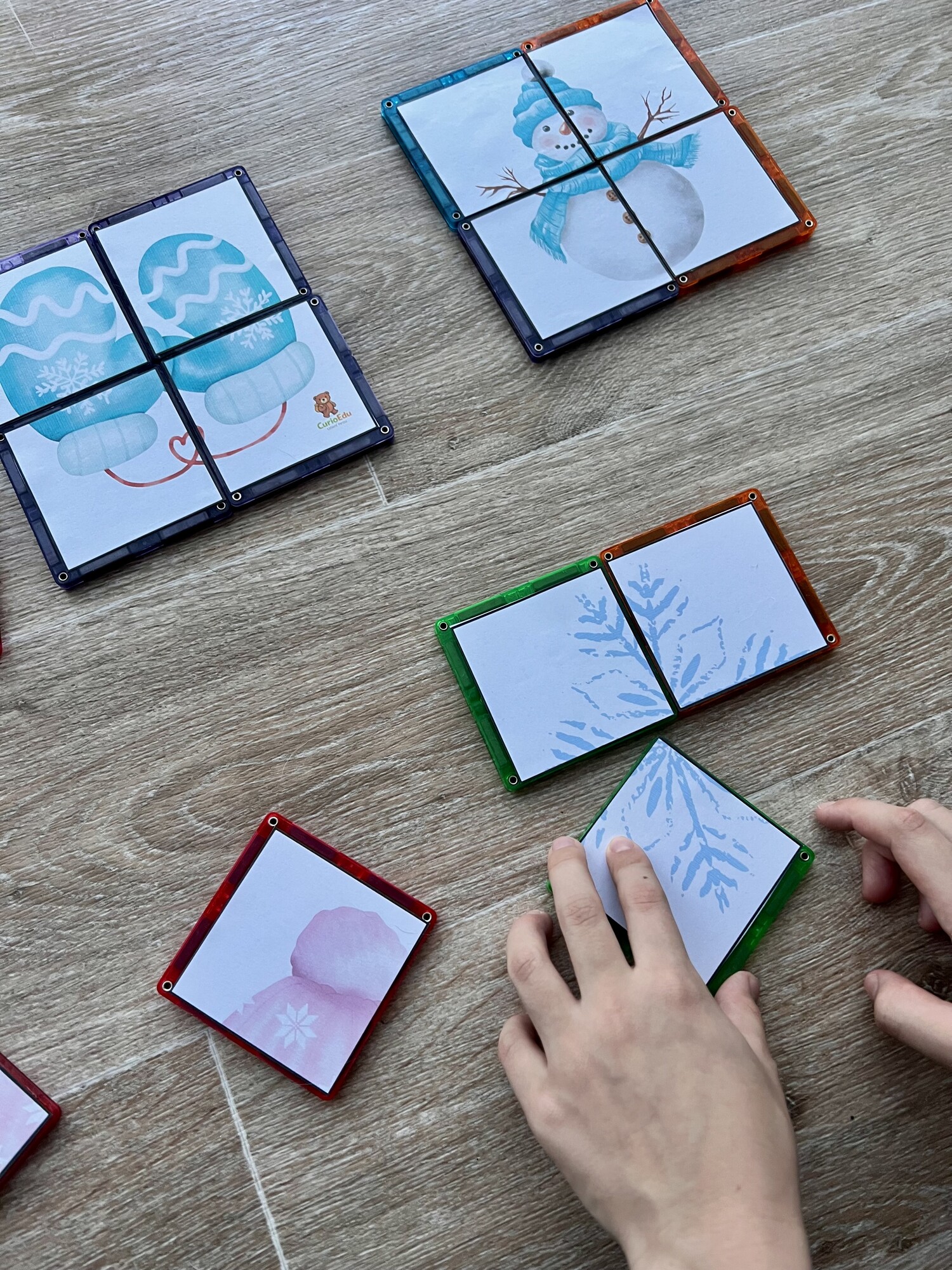 Tato barevná a vzdělávací skládačka obsahuje 4 dílky, které lze po vystřižení a přilepení na magnety snadno kombinovat s magnetickou stavebnicí. Na dílcích je 12 zimních motivů, které dětem přibližují kouzlo zimy a podporují jejich jemnou motoriku, vizuální vnímání a slovní zásobu.
