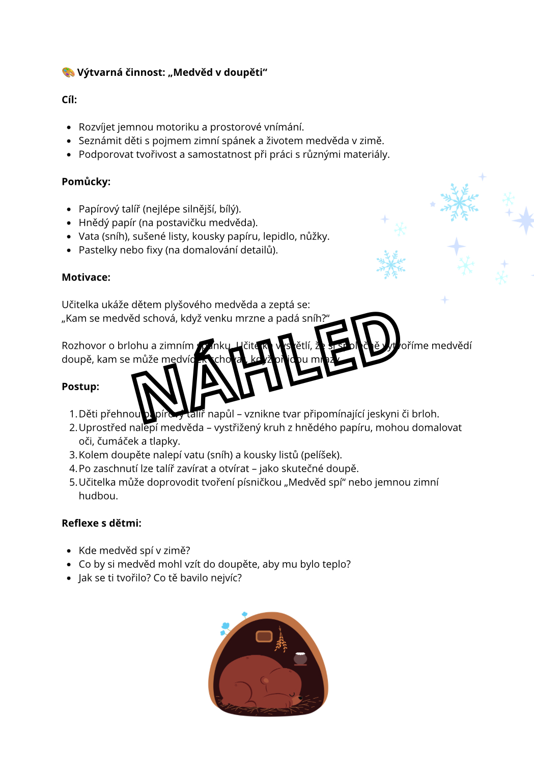 Projekt rozvíjí poznávací, jazykové, sociální i pohybové dovednosti dětí a přináší do školky kouzelnou zimní atmosféru plnou fantazie, zvířátek a hebkých pelíšků.