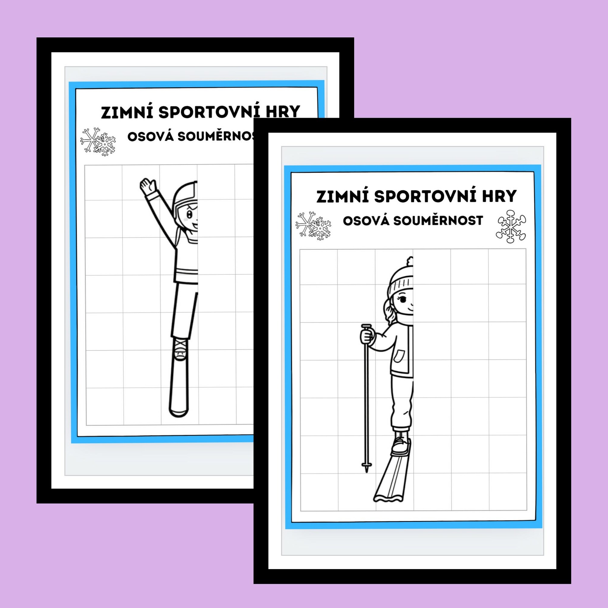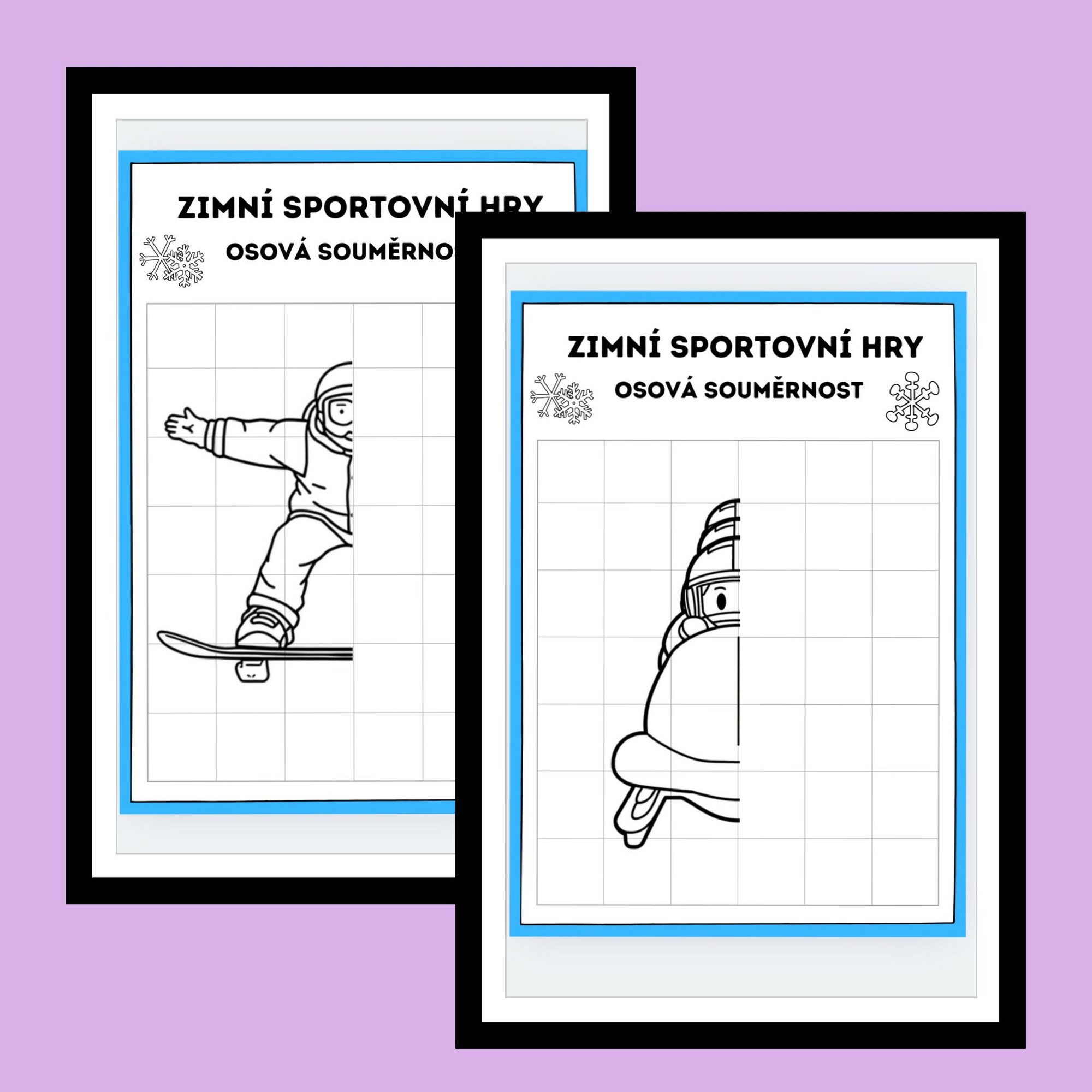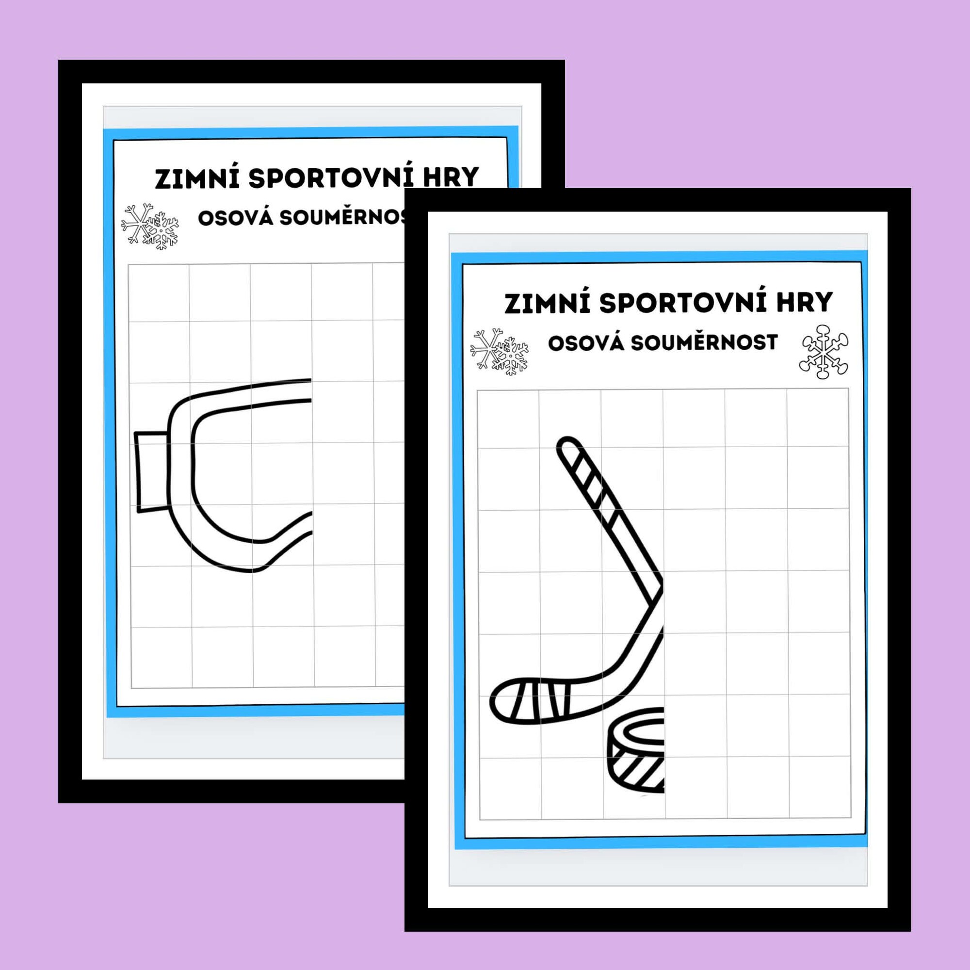 Materiál obsahuje 10 jednoduchých obrázků se zimní sportovní tematikou, které jsou rozděleny osou souměrnosti. Úkolem dětí je dokreslit chybějící polovinu obrázku podle předlohy. Obrázky jsou zvoleny tak, aby byly srozumitelné a přehledné i pro mladší děti.