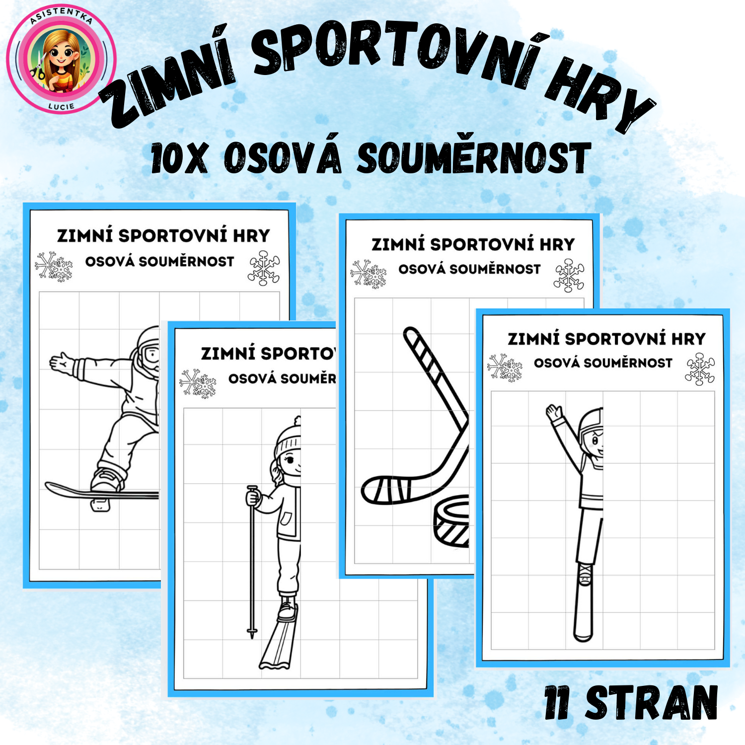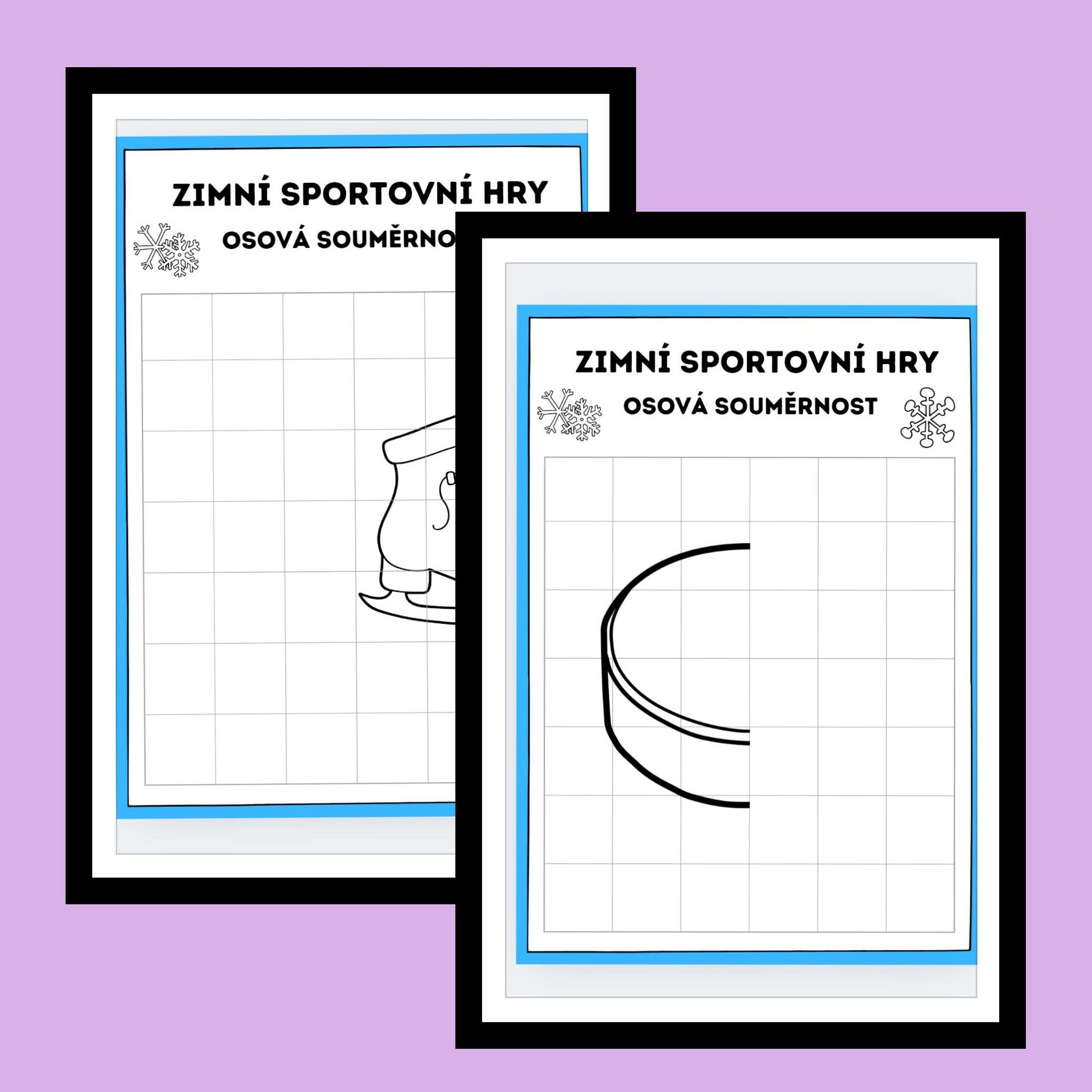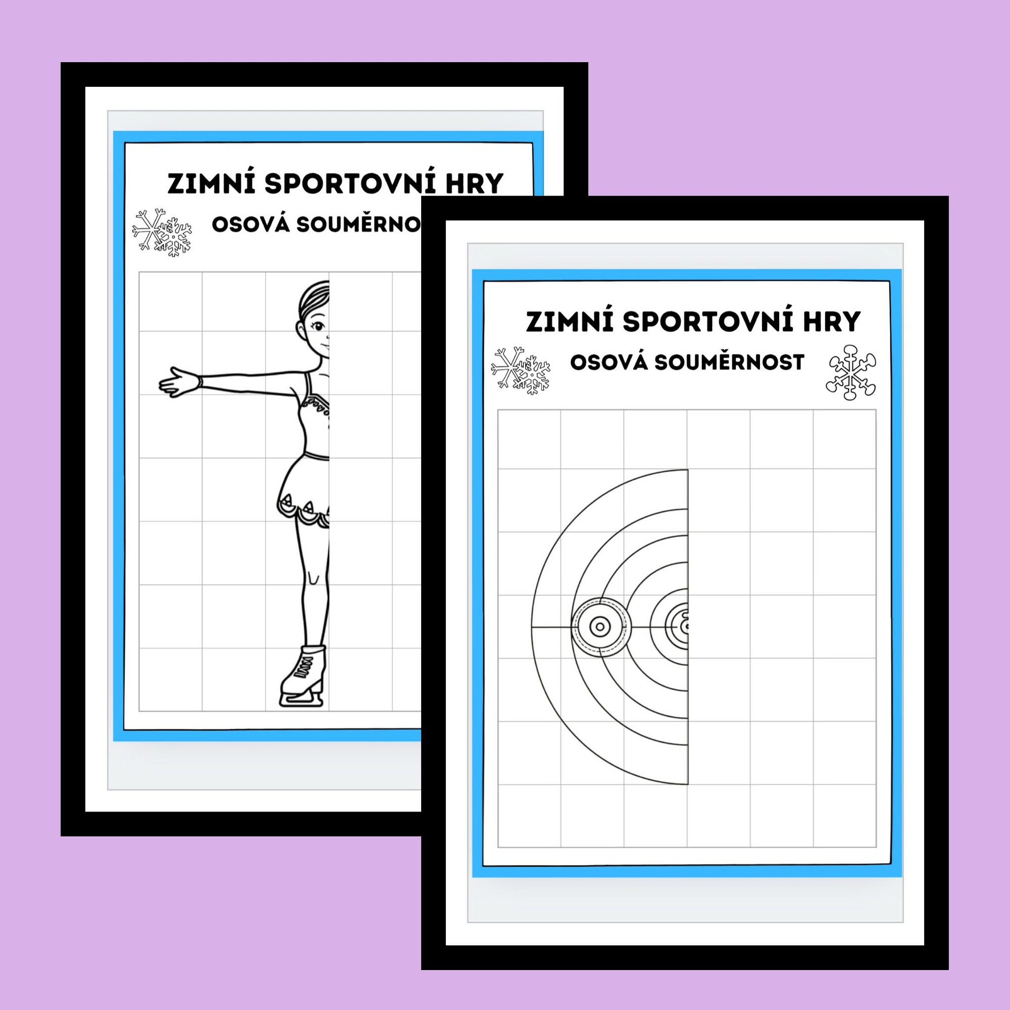 Materiál obsahuje 10 jednoduchých obrázků se zimní sportovní tematikou, které jsou rozděleny osou souměrnosti. Úkolem dětí je dokreslit chybějící polovinu obrázku podle předlohy. Obrázky jsou zvoleny tak, aby byly srozumitelné a přehledné i pro mladší děti.