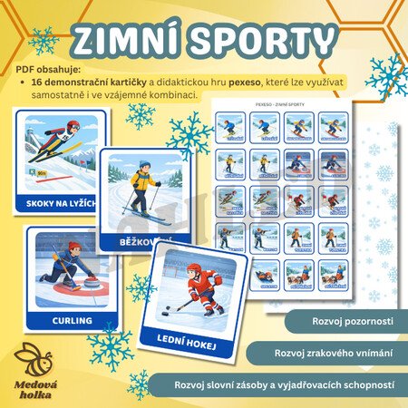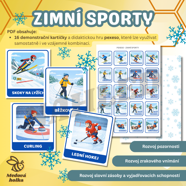 Demonstrační kartičky slouží k názornému seznámení dětí s jednotlivými zimními sporty, k rozvoji slovní zásoby a ke společnému povídání. Hra pexeso navazuje na práci s kartami a hravou formou podporuje rozvoj paměti, pozornosti a soustředění.