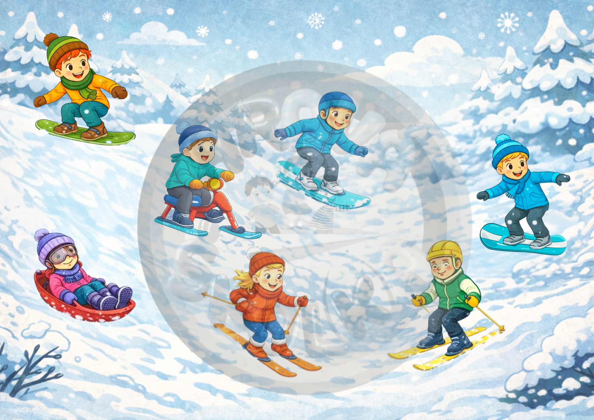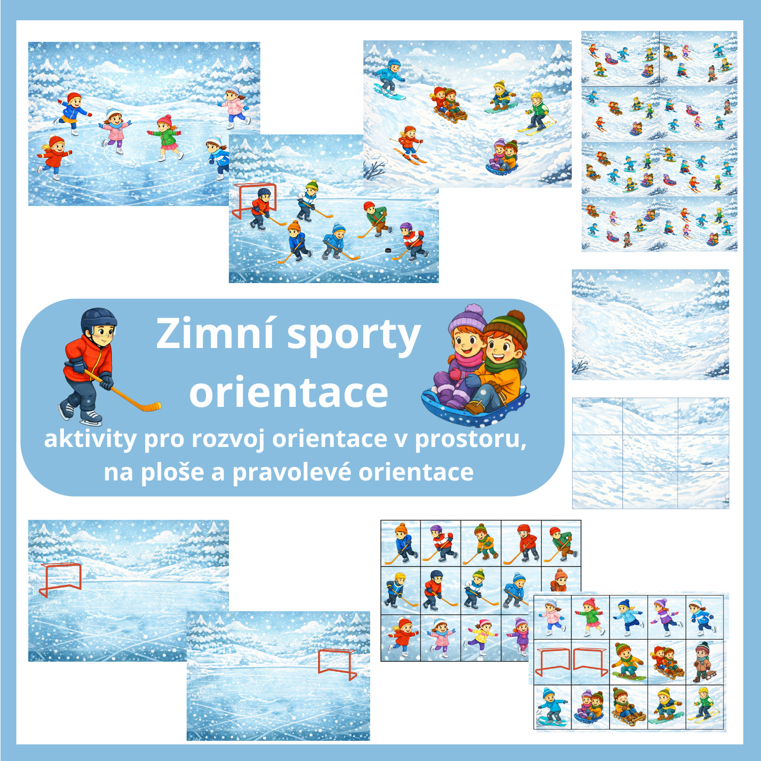 Soubor je určen pro děti předškolního věku. Rozvíjí zejména orientaci, ale také zrakové vnímání a pozornost. Soubor obsahuje: Průvodní list,2x obrázek prázdného kluziště - formát A4 a A3,2x obrázek prázdného lyžařského svahu - formát A4, A3, 2 x 24 karet se situacemi - 8 karet hokej, 8 karet bruslení děvčat, 8 karet lyžování, sáňkování, snowboarding... (karty jsou ve formátu A4 - pro skupinovou nebo frontální činnost a ve formátu A6 pro individuální činnost), 2x 33 + 2 karet s obrázky dětí a hokejových branek k doplňování situací dle předlohy,2 x obrázek kluziště s brankou - vlevo x vpravo pro procvičování pravolevé orientace, 2x obrázek s mřížkou s 9 okny pro procvičování orientace na ploše. Soubor není náročný na stříhání.