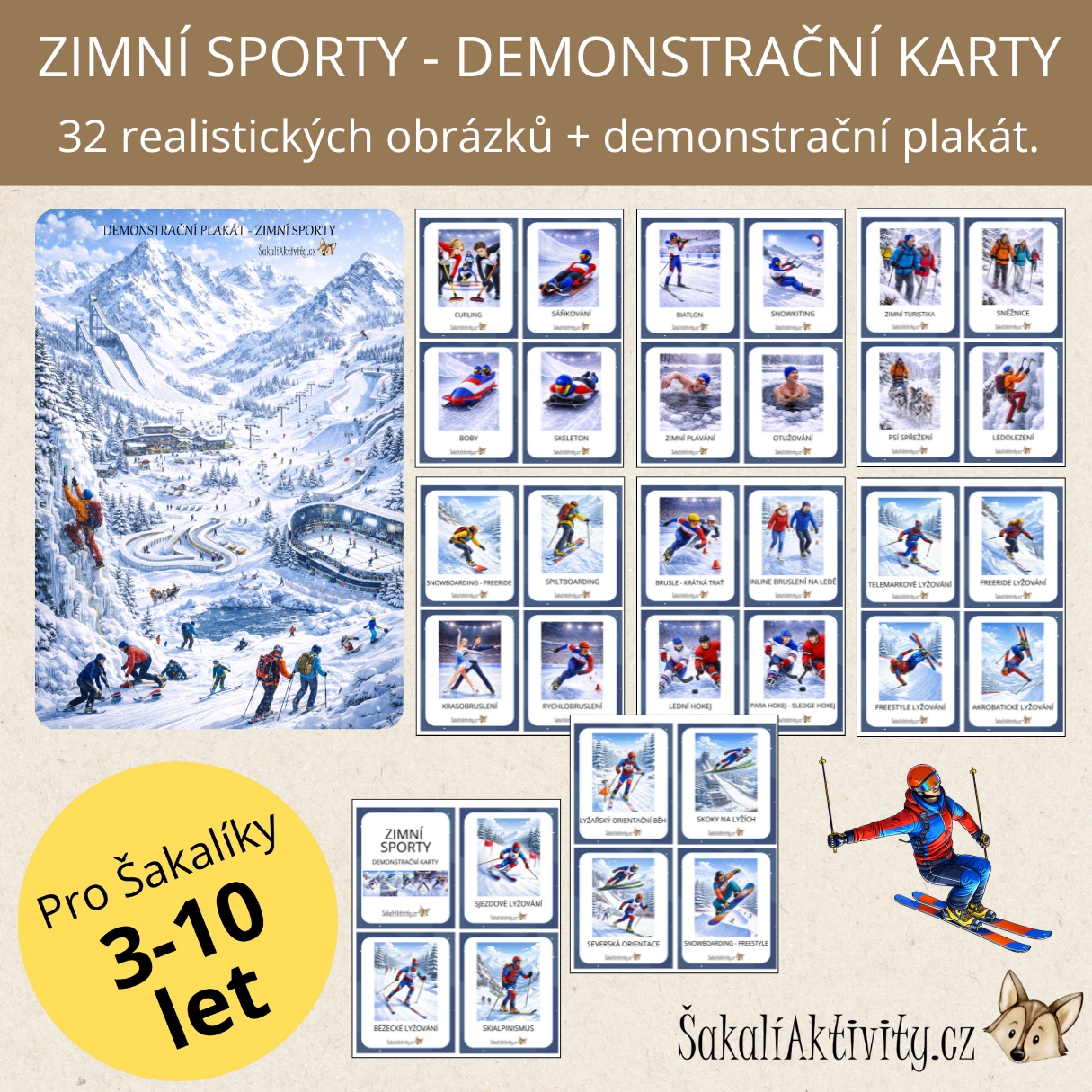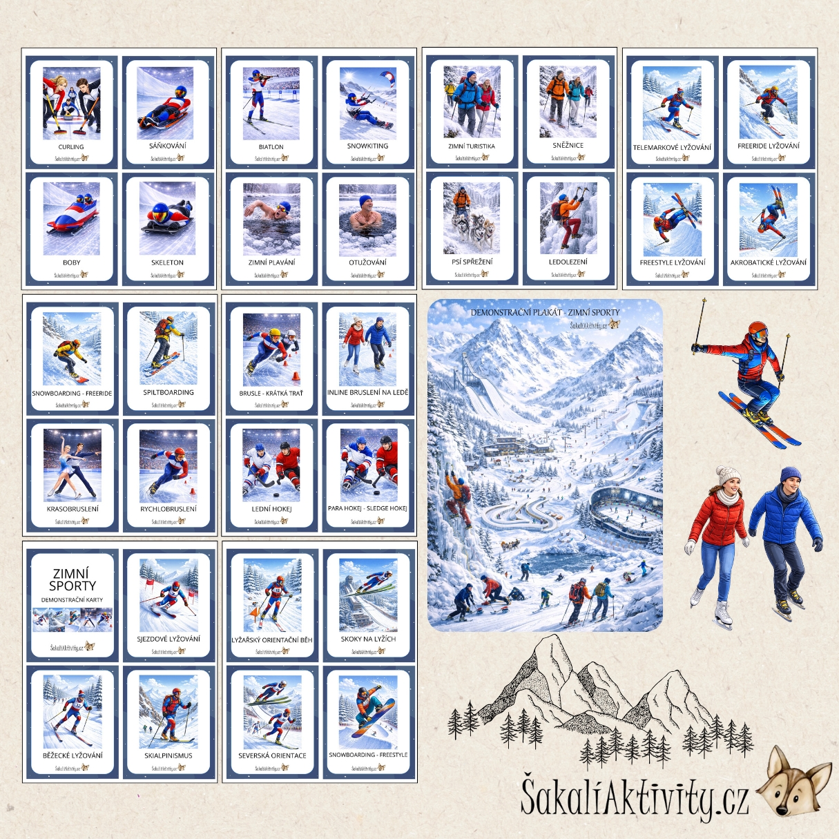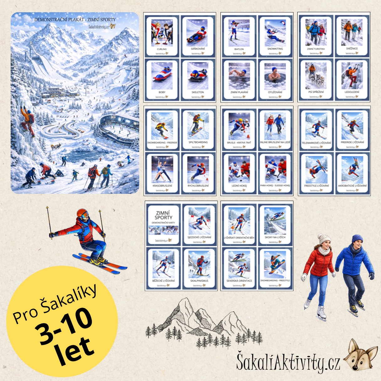 Soubor Zimní sporty – realistické – demonstrační karty je určen dětem předškolního a mladšího školního věku a nabízí přehled 32 demonstračních karet ve formátu A5. Každá karta zobrazuje konkrétní zimní sport nebo aktivitu pomocí realistických až polorealistických ilustrací, které dětem usnadňují pochopení pohybu, postoje těla i sportovního vybavení.