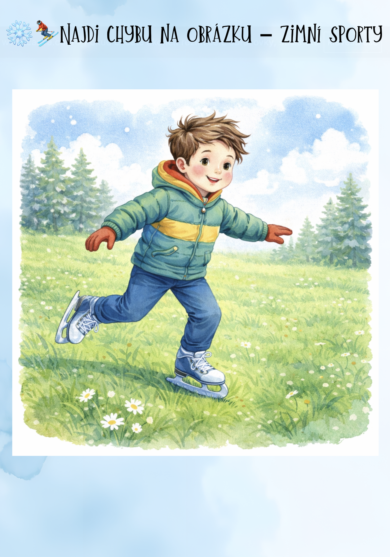 ⚠️ najdi chybu na obrázku (bezpečnost – např. lyžař bez helmy, bruslař na trávě)