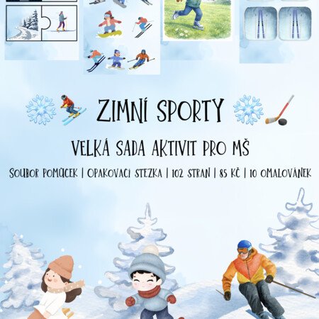 Přinášíme vám rozsáhlý vzdělávací soubor na téma zimní sporty, který obsahuje 102 stran plných her, úkolů, pohybu a zábavného učení pro děti v mateřské škole. Materiál je sestaven tak, aby děti zimní sporty poznávaly, prožívaly a opakovaly hravou formou.
