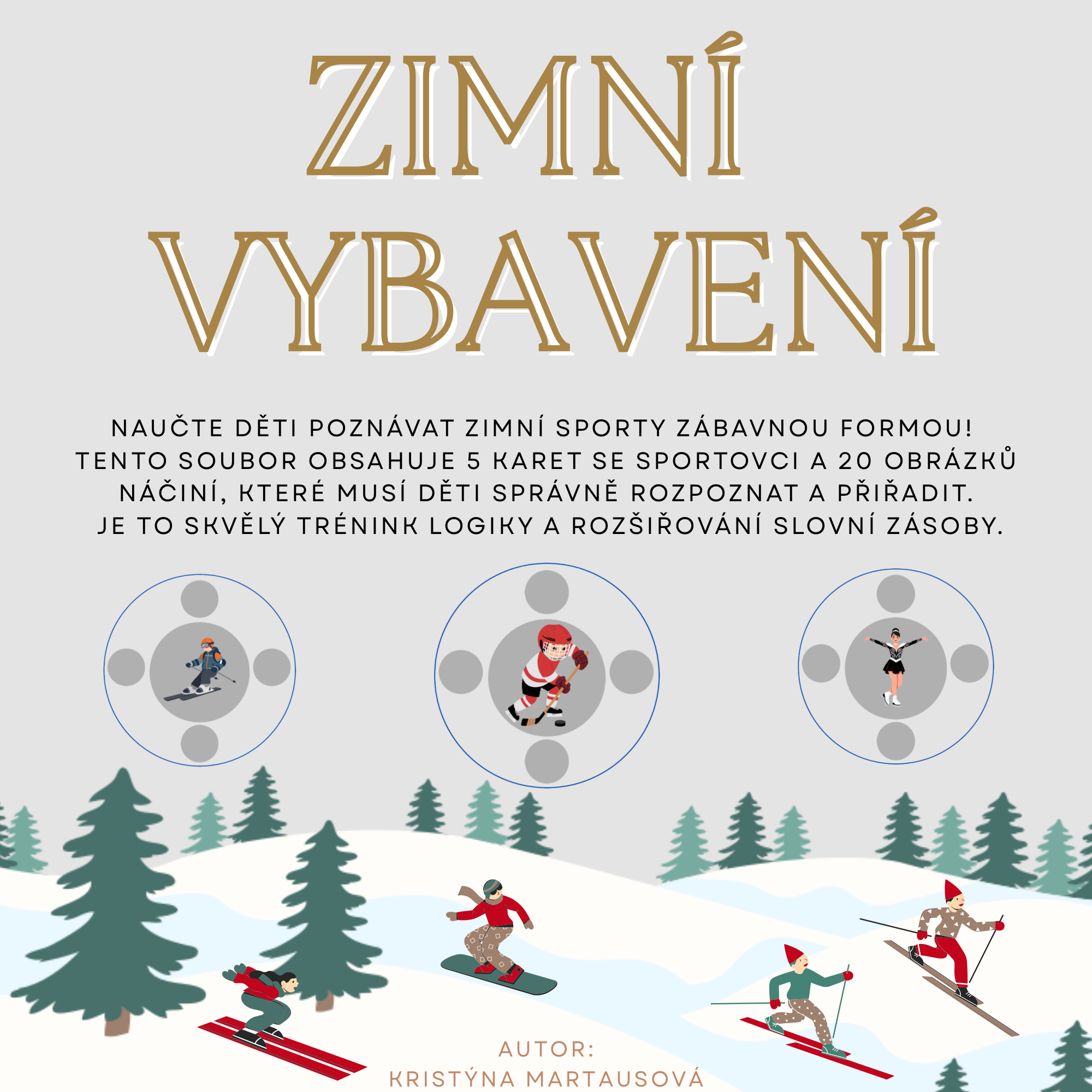 Naučte děti poznávat zimní sporty zábavnou formou! Tento soubor obsahuje 5 karet se sportovci a 20 obrázků náčiní, které musí děti správně rozpoznat a přiřadit. Je to skvělý trénink logiky a rozšiřování slovní zásoby.