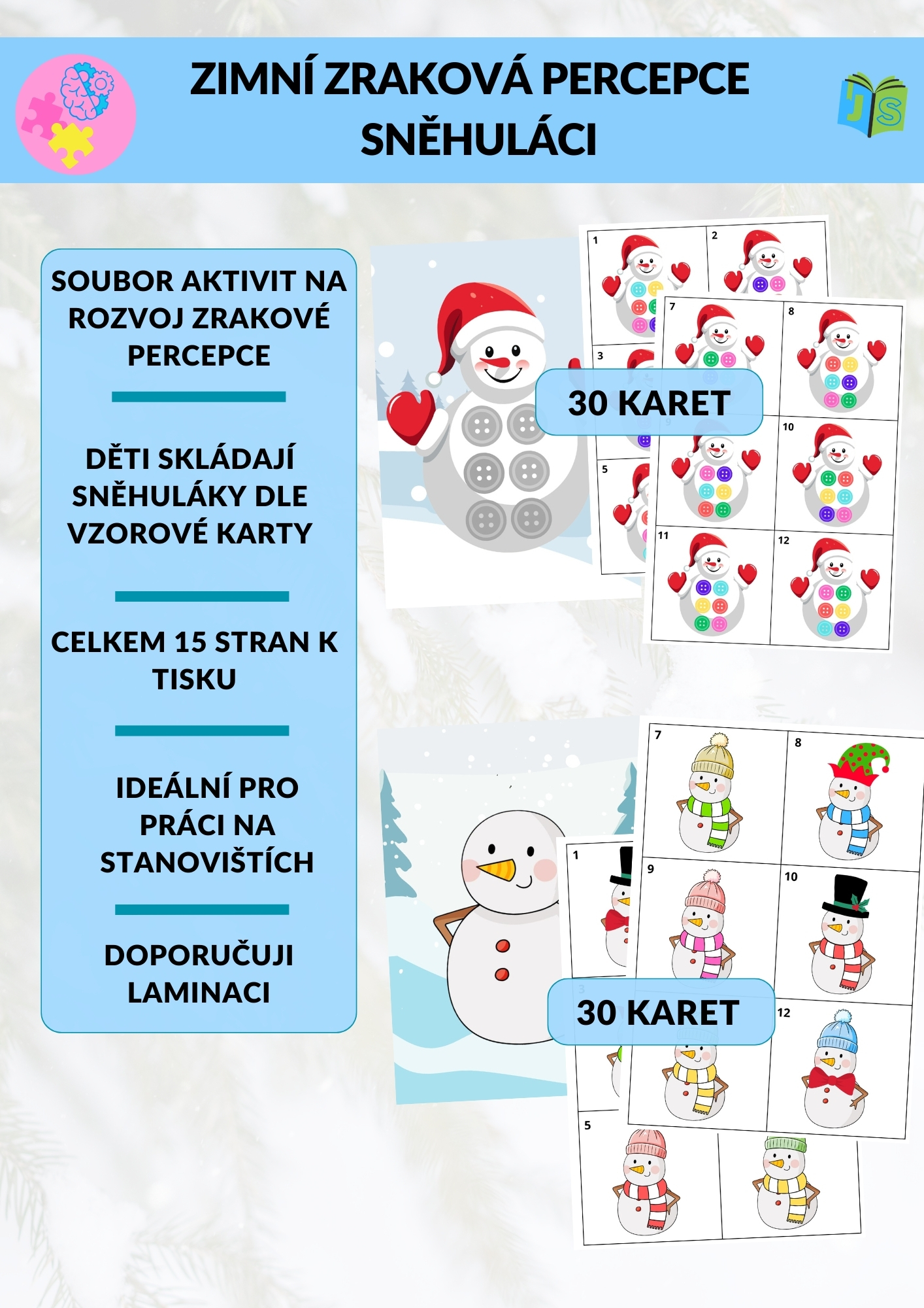 Jednoduchá a přitom velmi účinná zimní aktivita na rozvoj zrakové percepce. Děti skládají sněhuláky podle vzorové karty – procvičují pozornost, paměť a práci podle vzoru hravou formou, která je ideální i pro samostatnou práci.