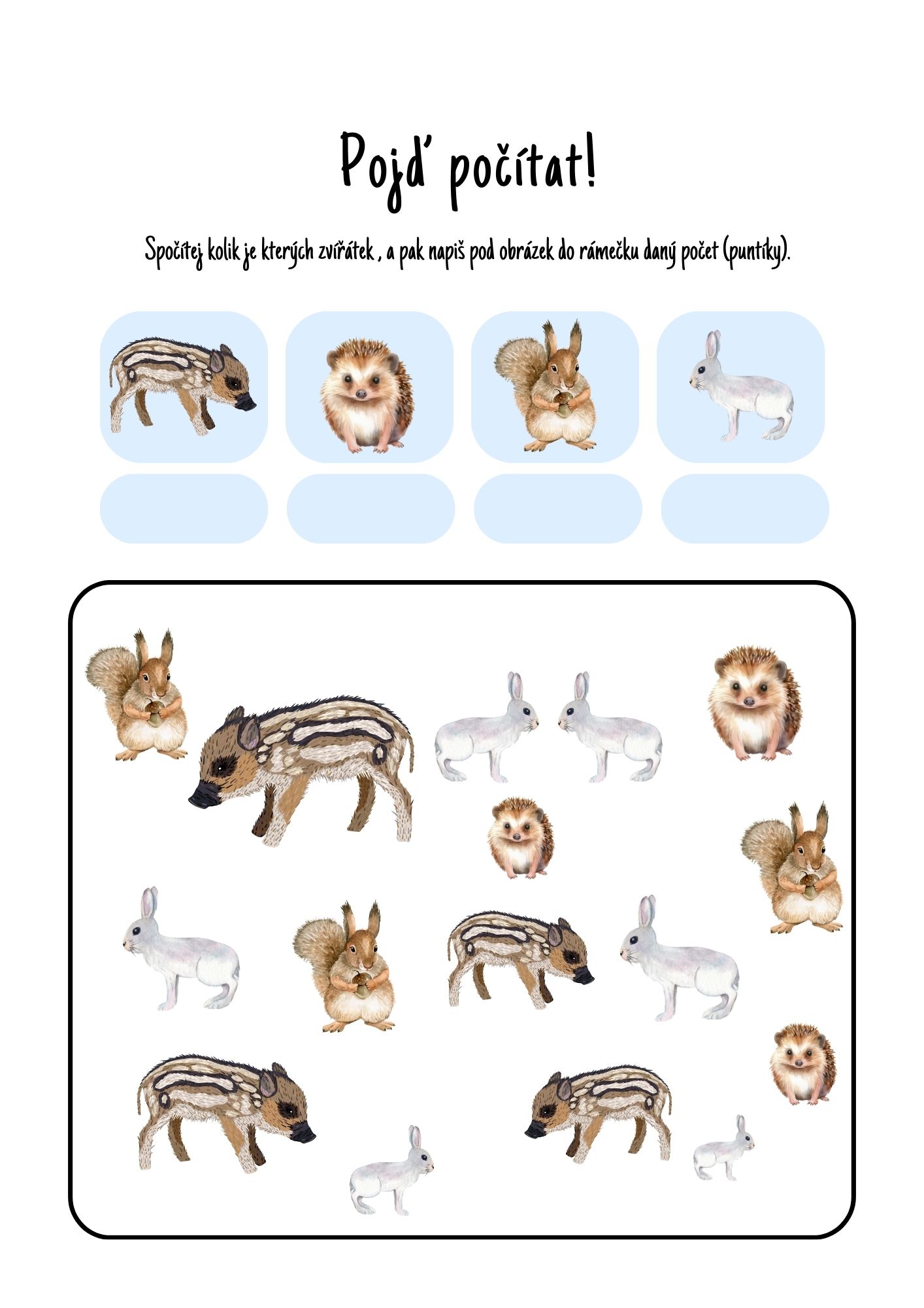 - prac. list -pojď počítat: matematická gramotnost - spočítej kolik je kterých zvířátek , a pak napiš pod obrázek do rámečku daný počet (puntíky)