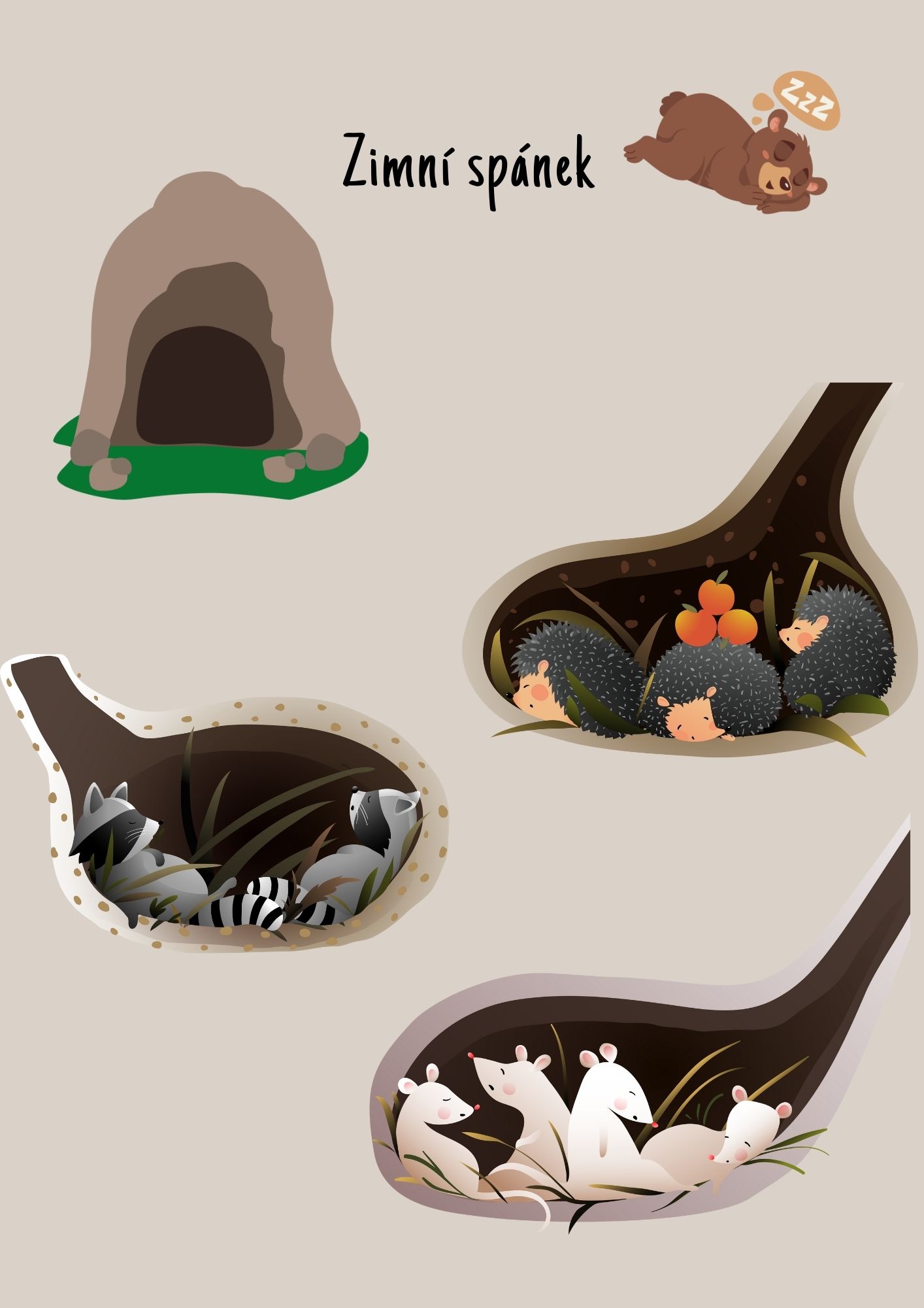 - Zimní spánek - ilustrace zvířat v jejich úkrytech