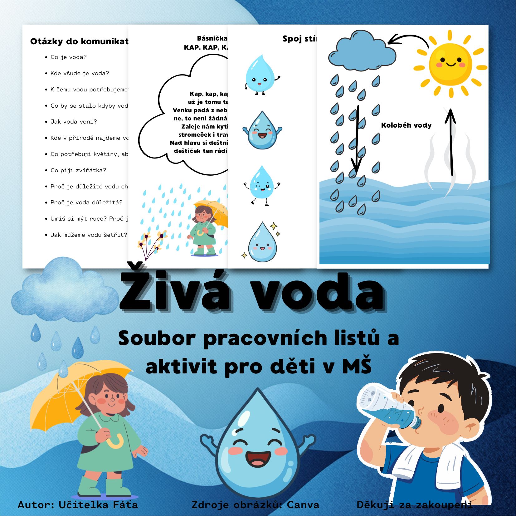 Součástí materiálu je průvodní list s cíli a zaměřením, otázky do komunikativního kruhu podporující rozvoj slovní zásoby a vyjadřování, demonstrační obrázky (např. moře, řeka, rybník, potok) a básnička „Kap, kap, kap“. Pracovní listy rozvíjejí grafomotoriku, zrakové vnímání i matematické představy (spojování kapek, stíny, počítání podle kostky, koloběh vody, přiřazování obrázků, vybarvování, stříhání).
