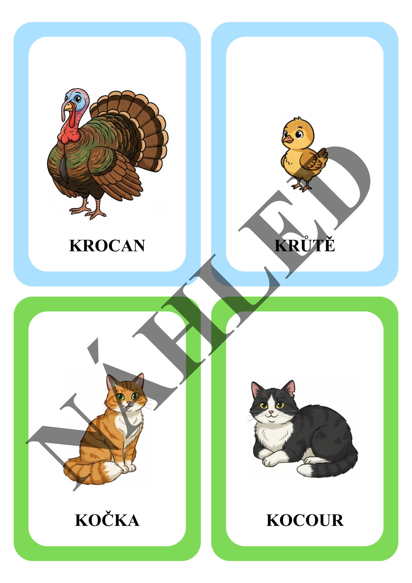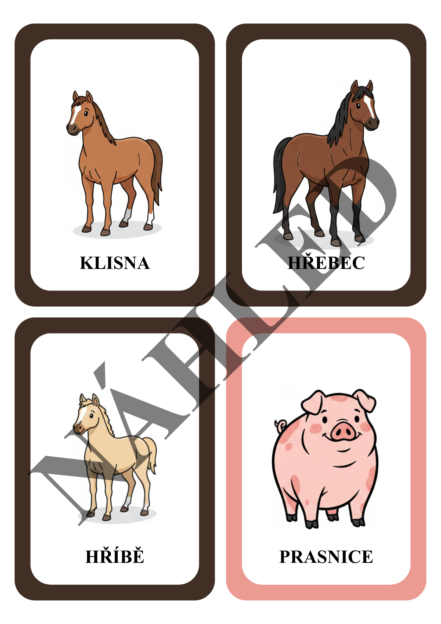 - 36 demonstračních kartiček - 12 různých zvířat - samičky, samečka a mláděte