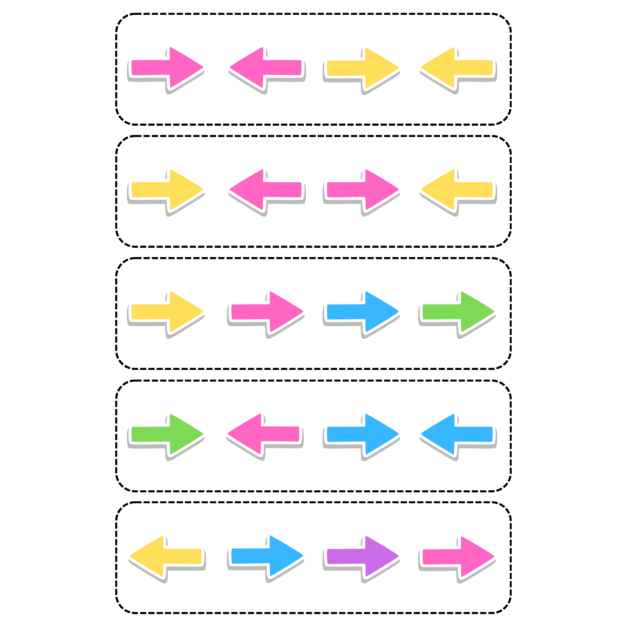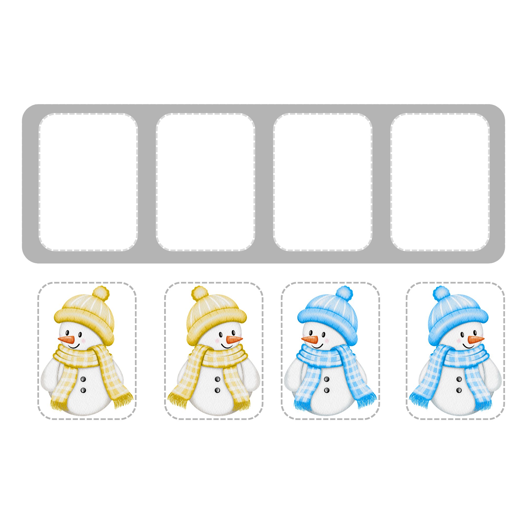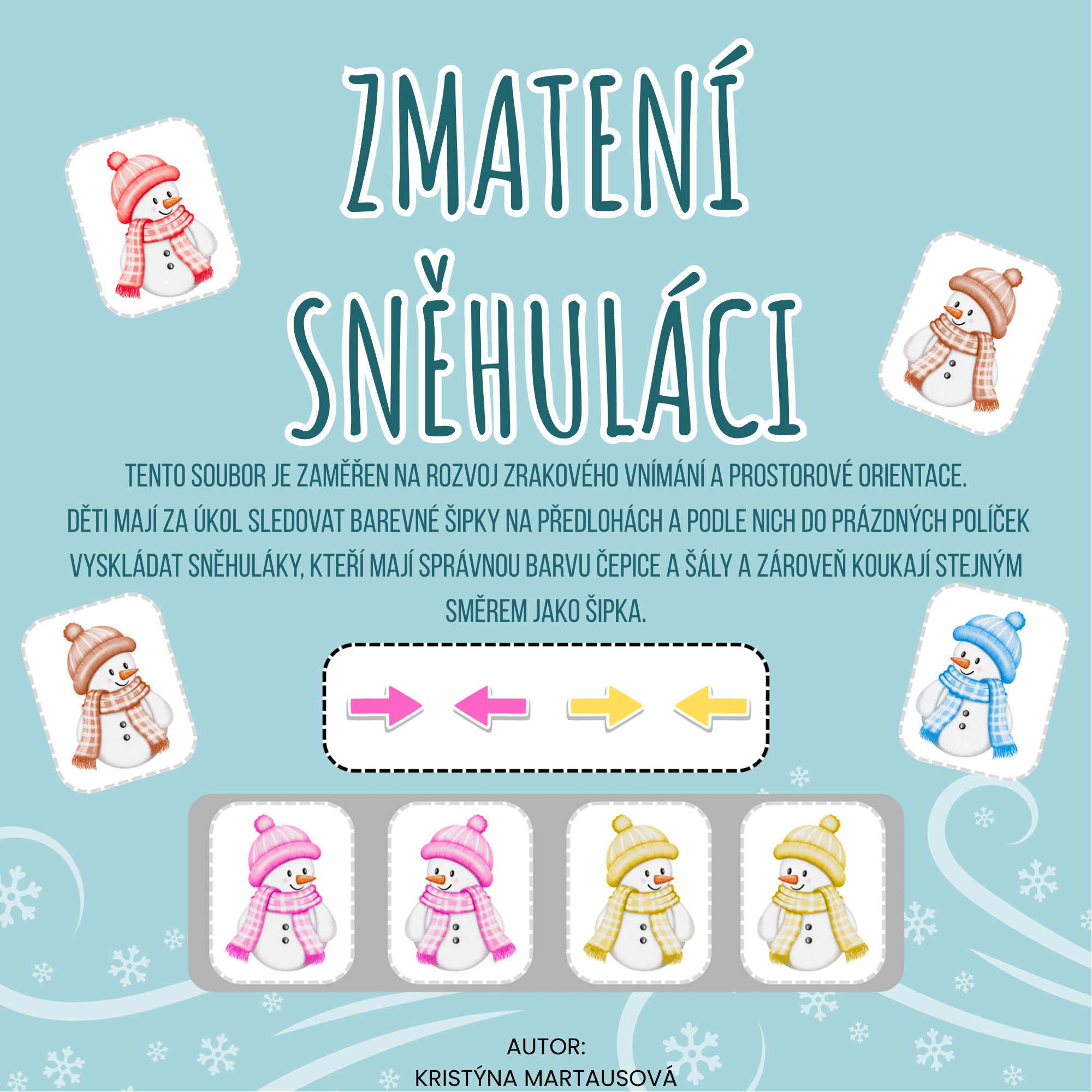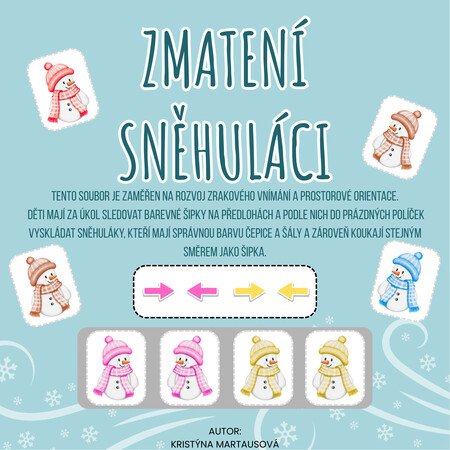 Tento soubor je zaměřen na rozvoj zrakového vnímání a prostorové orientace. Děti mají za úkol sledovat barevné šipky na předlohách a podle nich do prázdných políček vyskládat sněhuláky, kteří mají správnou barvu čepice a šály a zároveň koukají stejným směrem jako šipka.