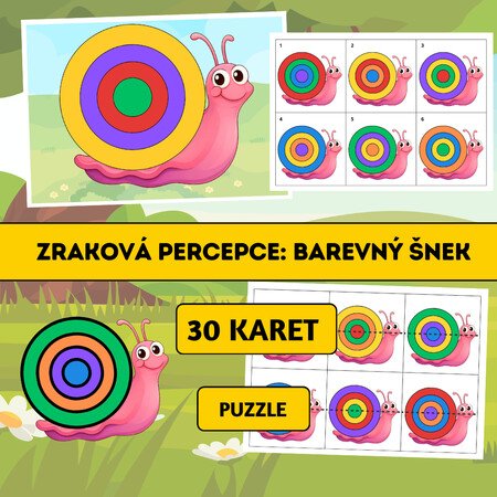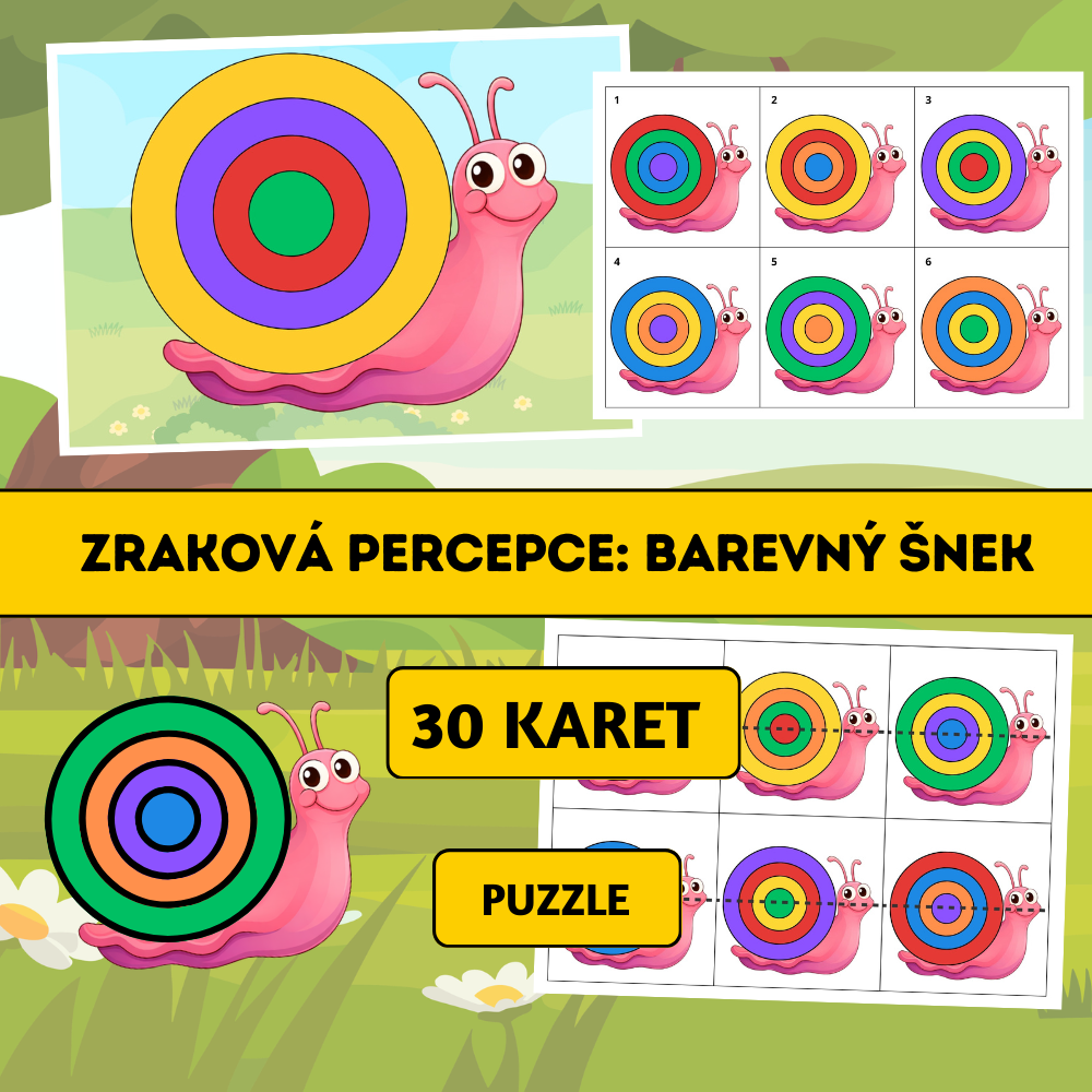 Zraková percepce: Barevný šnek je tematický vzdělávací materiál zaměřený na rozvoj zrakového vnímání, vizuální diferenciace, paměti a logického myšlení. Aktivita podporuje soustředění, prostorovou orientaci i jemnou motoriku.