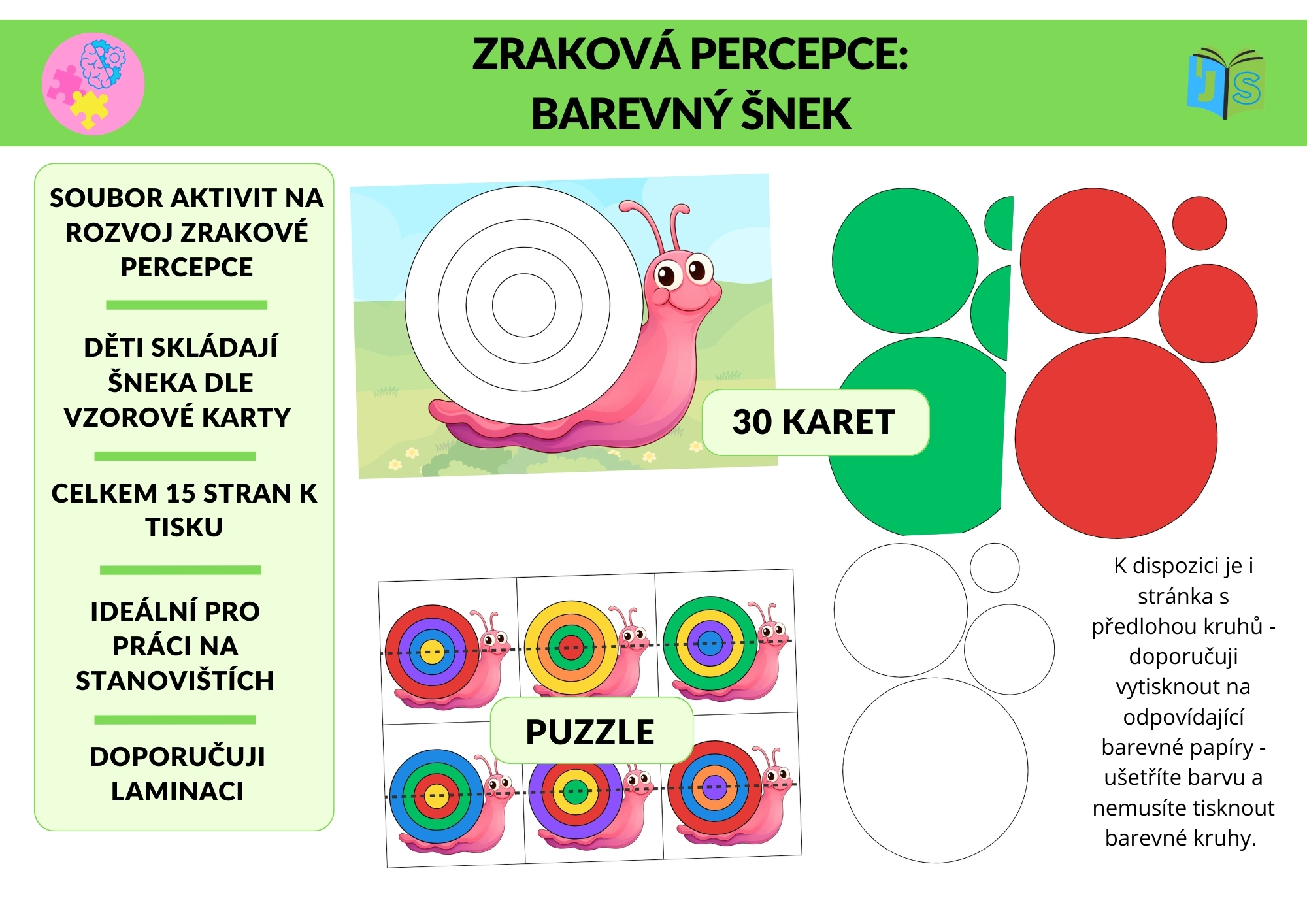 Děti skládají barevnou ulitu šneka podle 30 vzorových karet. Z nabídky kruhů vybírají správné 4 barvy a řadí je přesně podle předlohy. Součástí souboru je podkladová karta s vyznačenými obrysy dílků, která slouží jako vizuální opora a podporuje představivost dětí při pochopení principu skládání.
