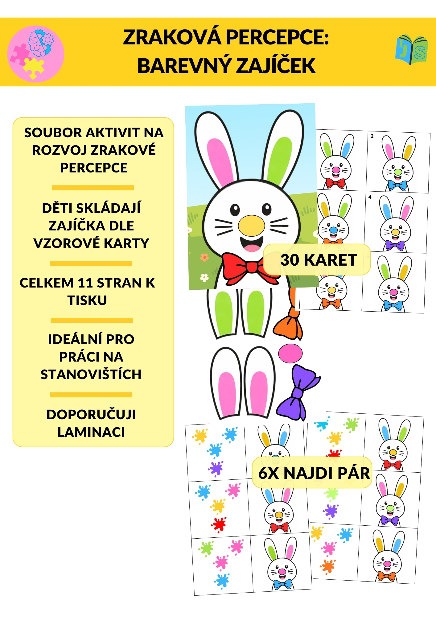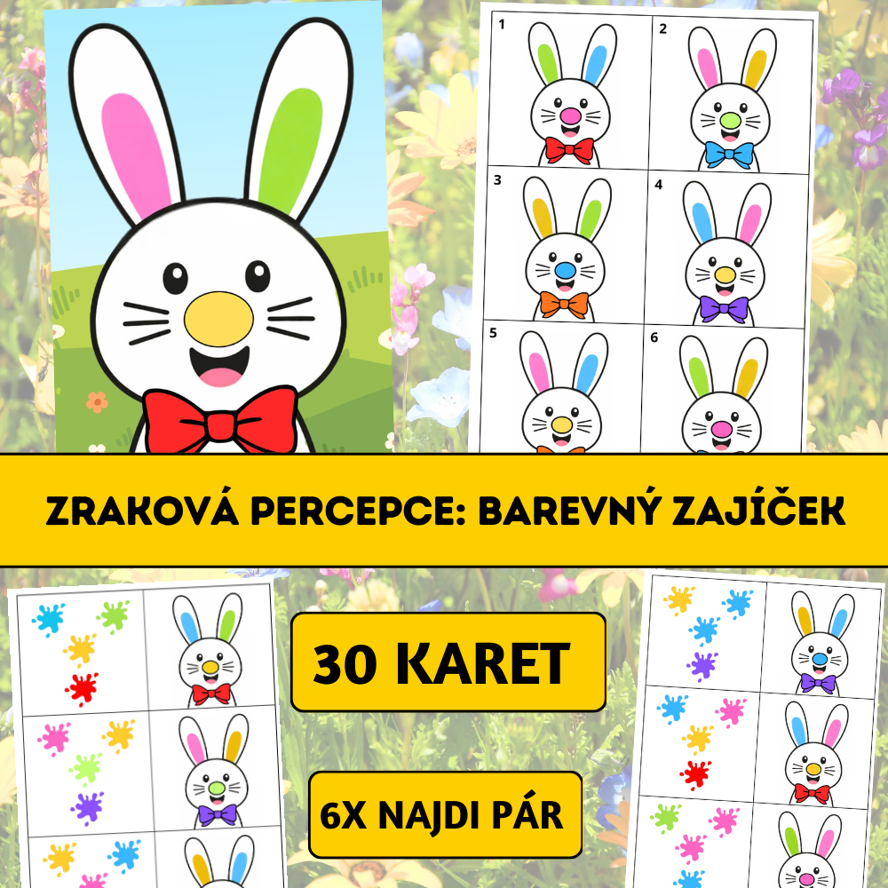 Soubor Zraková percepce: Barevný zajíček je hravá aktivita zaměřená na rozvoj zrakového vnímání, vizuální paměti a koncentrace pozornosti.