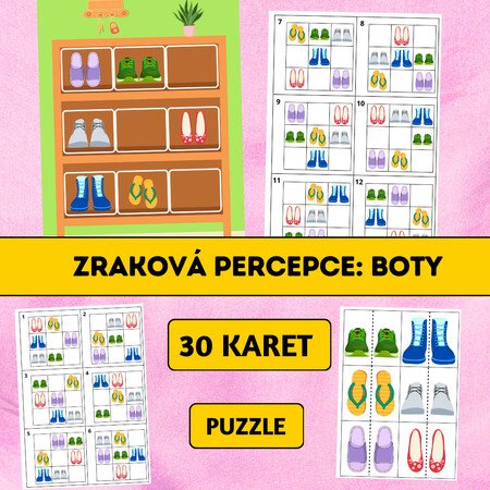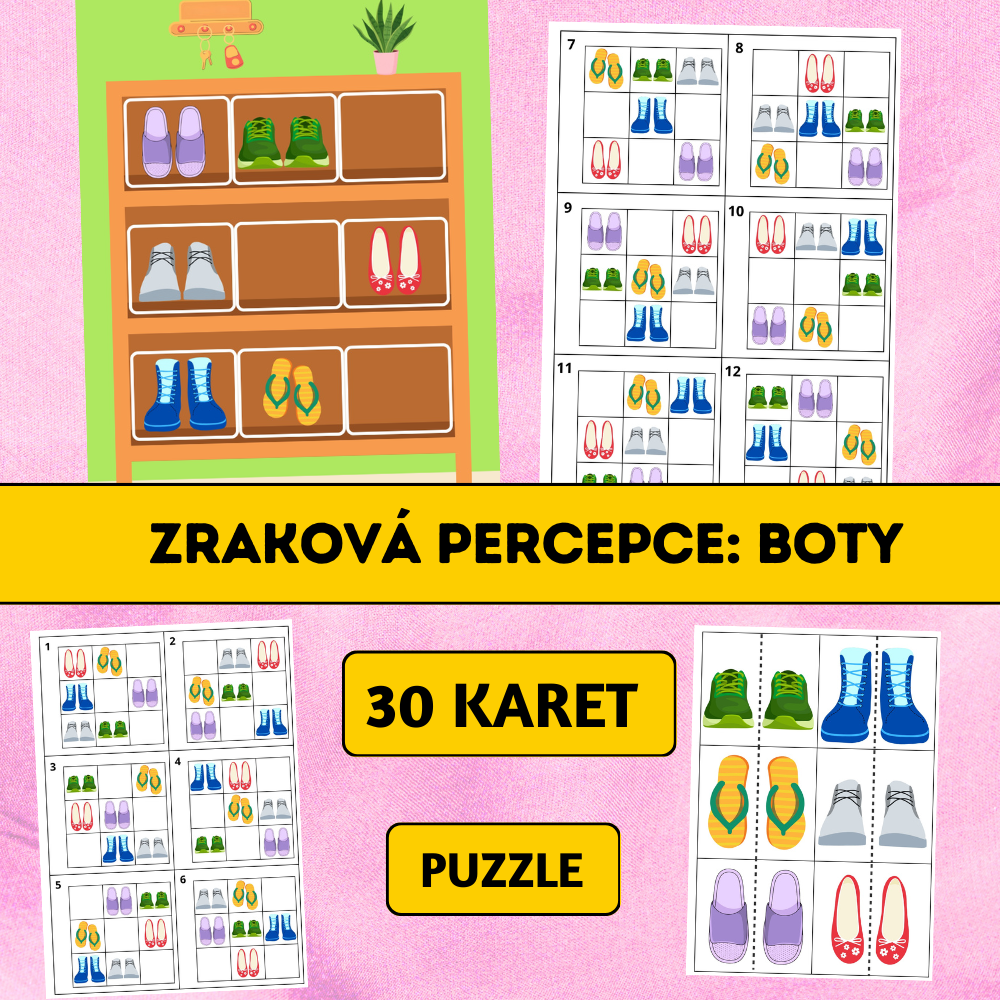 Soubor Zraková percepce: Boty je hravá vzdělávací aktivita zaměřená na rozvoj zrakové percepce, logického myšlení a prostorové orientace. Děti skládají obrázky bot do mřížky podle vzorových karet a učí se pečlivě porovnávat jednotlivé detaily.