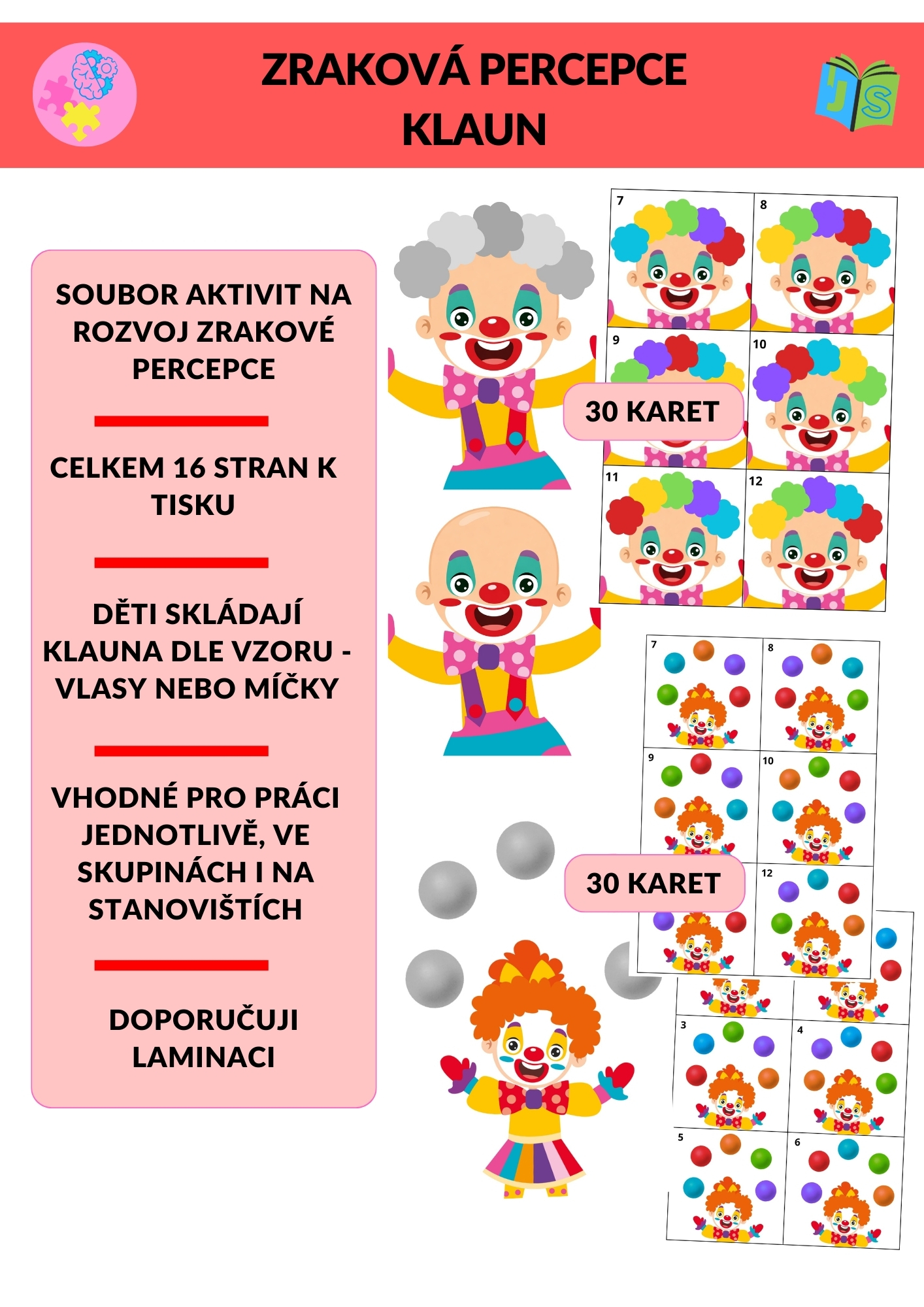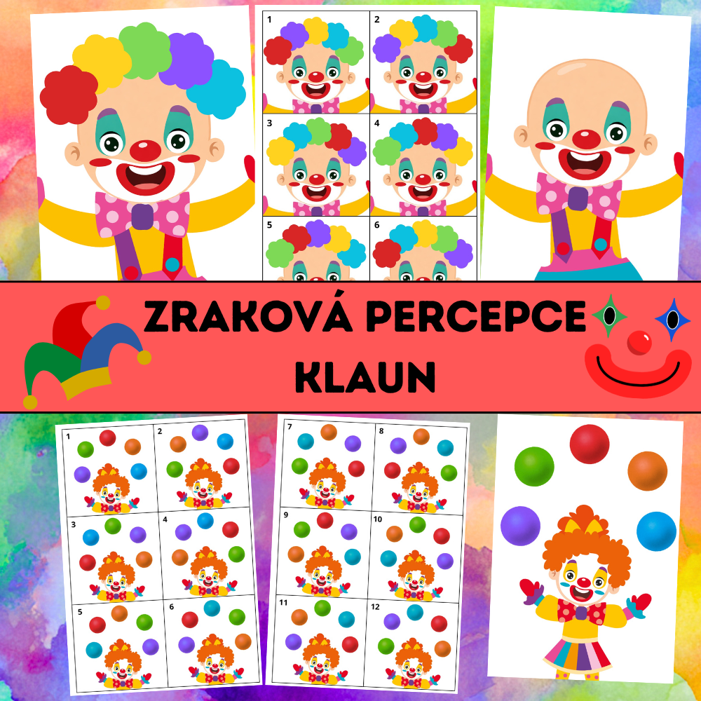 Zraková percepce – Klaun je hravý vzdělávací materiál zaměřený na rozvoj vizuálního vnímání, pozornosti a schopnosti práce podle předlohy. Díky veselému klaunskému motivu je aktivita ideální zejména pro období karnevalu a masopustu, ale využitelná je po celý rok.