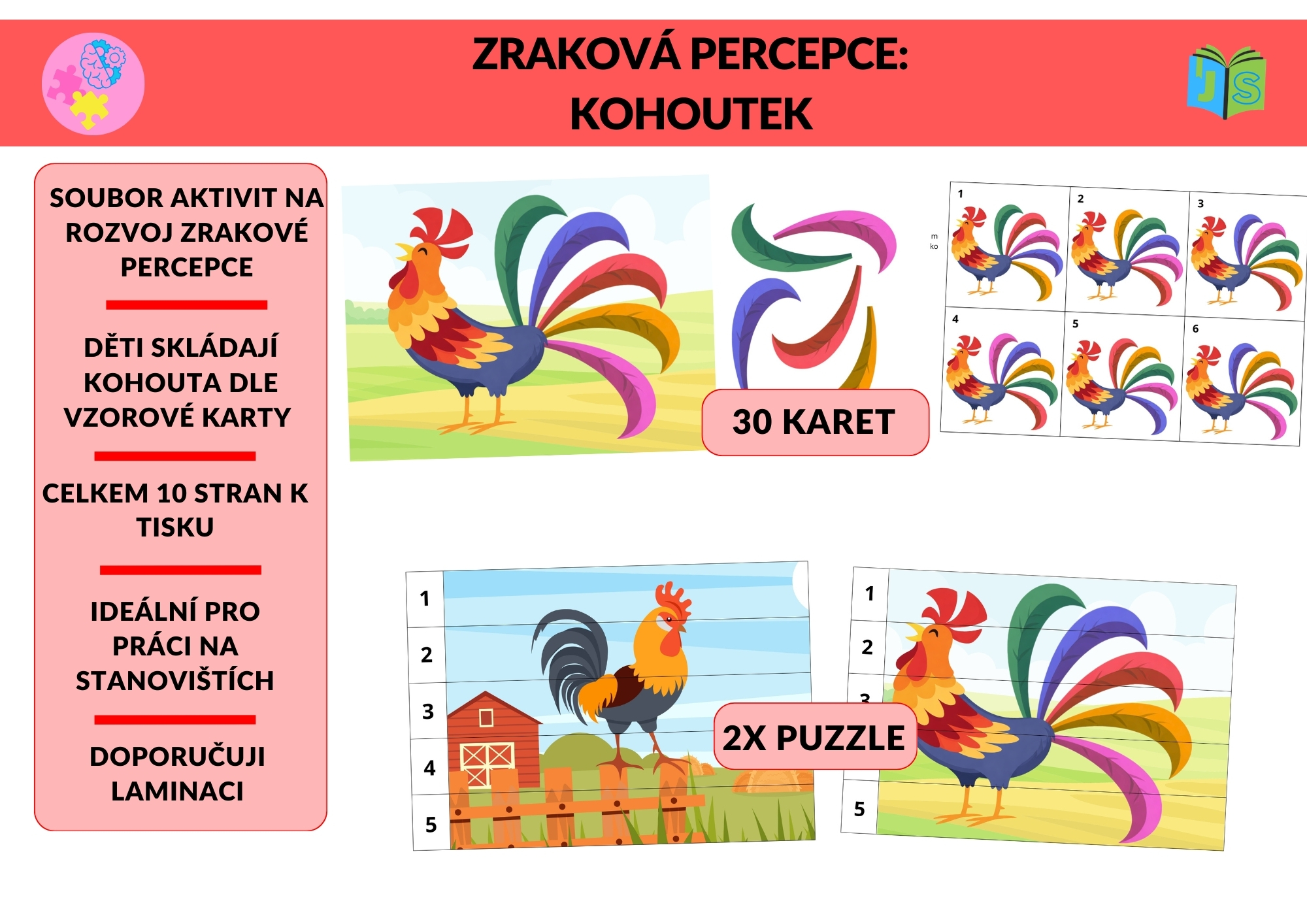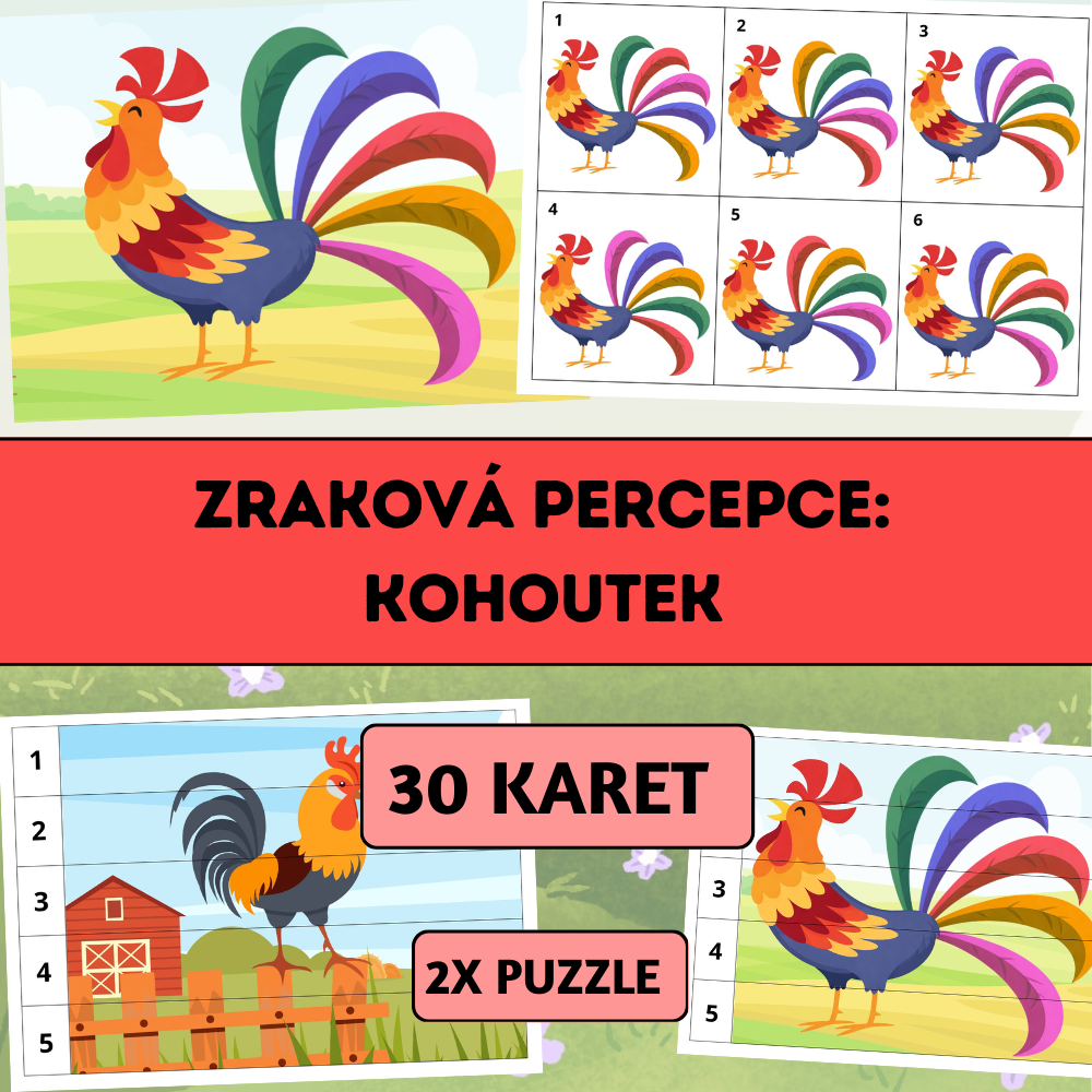 Zraková percepce: Kohoutek je hravý vzdělávací materiál zaměřený na rozvoj zrakového vnímání, pozornosti, prostorové orientace a vizuální paměti.