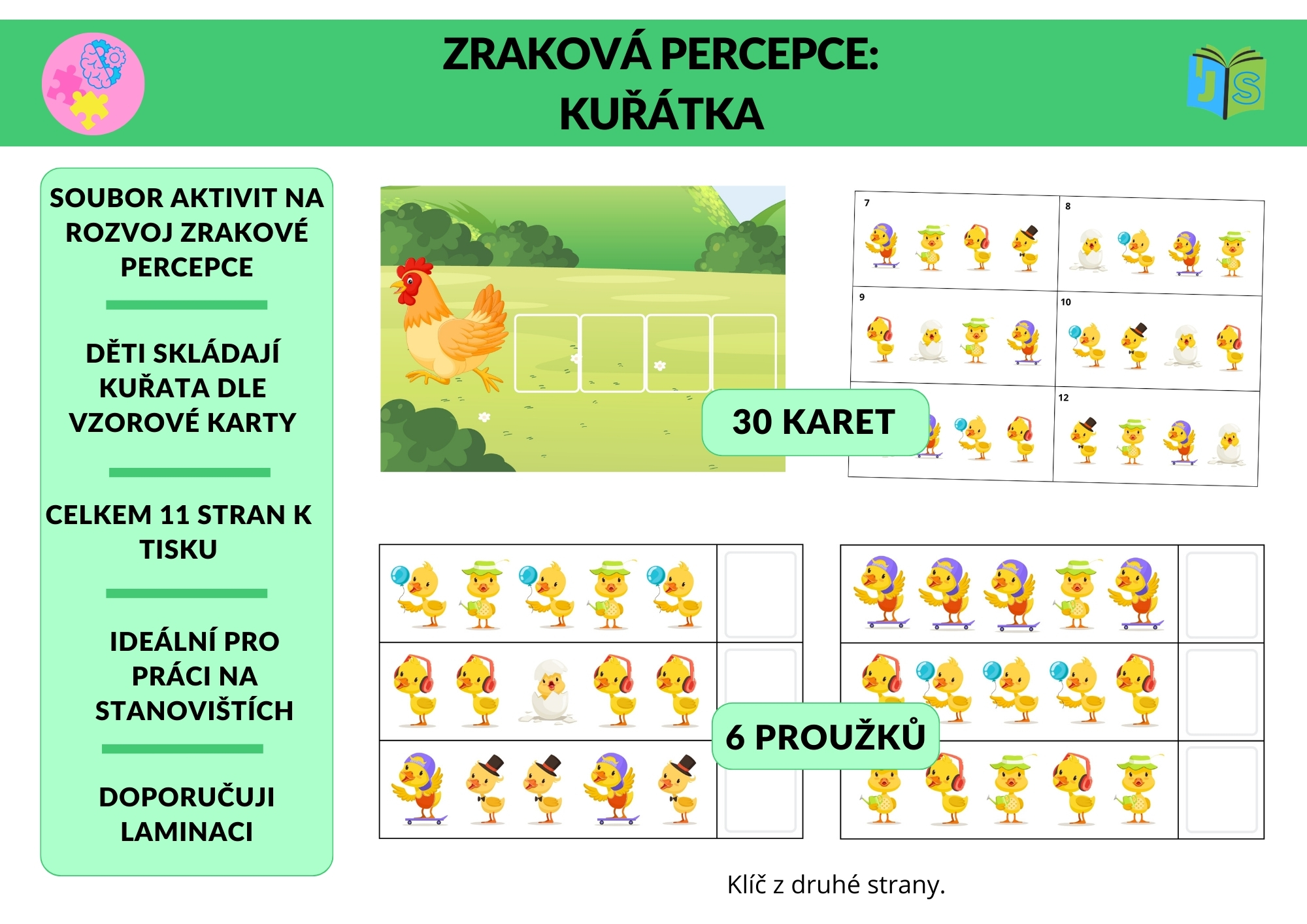 Soubor obsahuje 30 unikátních vzorových karet, na kterých jsou vždy 4 kuřátka vybraná ze 6 různých kuřátek. Dítě vybírá správná kuřata a skládá je na podkladovou kartu ve správném pořadí. Aktivita podporuje koncentraci, přesnost a schopnost porovnávat detaily.