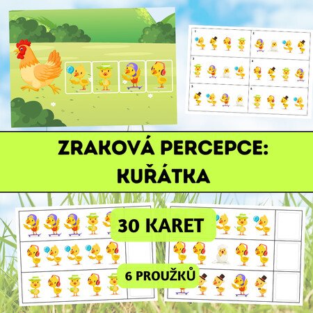 Zraková percepce – Kuřátka je hravý vzdělávací materiál zaměřený na rozvoj zrakového vnímání, pozornosti k detailu, vizuální paměti a logického myšlení. Děti skládají 4 kuřátka do správného pořadí podle vzorových karet a učí se pracovat systematicky podle předlohy.