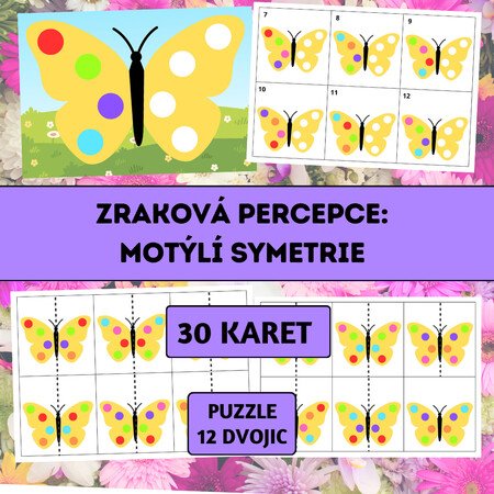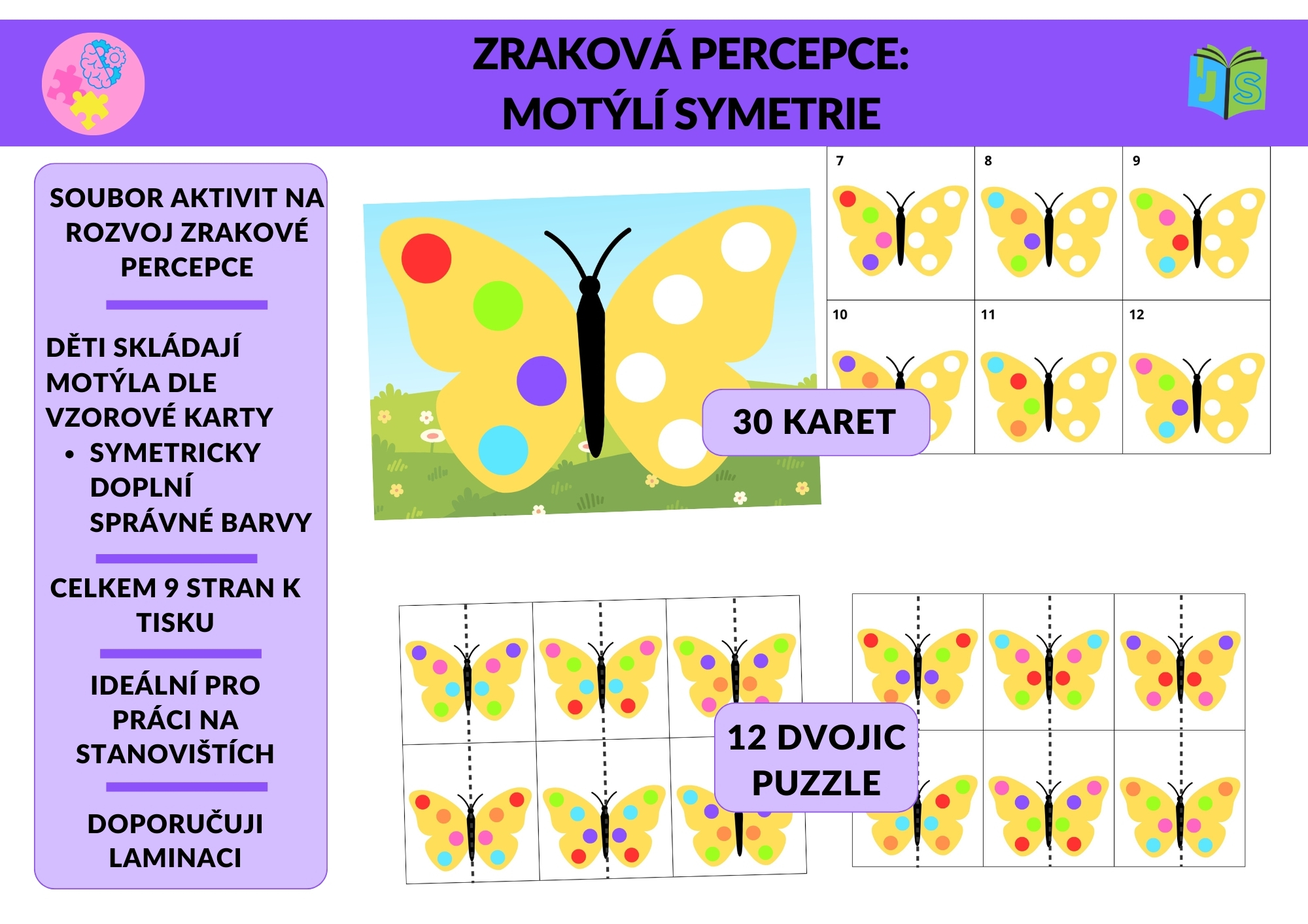 Zraková percepce – Motýlí symetrie je vzdělávací materiál zaměřený na rozvoj zrakového vnímání, vizuální paměti, prostorové orientace a pochopení principu osové souměrnosti. Aktivita probíhá ve dvou krocích – děti nejprve sestaví levou část motýla podle vzorové karty a následně pravou část doplní zrcadlově, tedy symetricky.