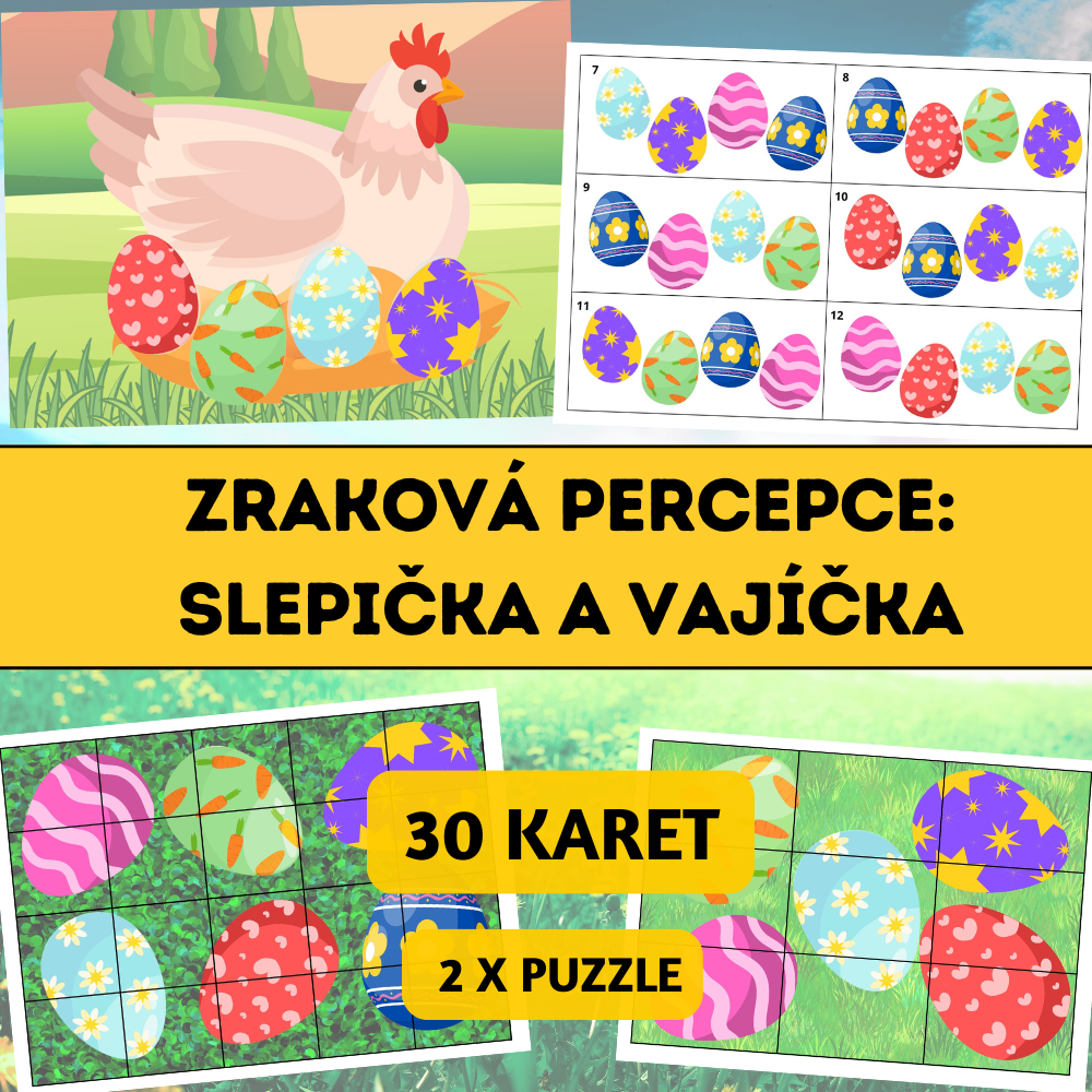 Zraková percepce – Slepička a vajíčka je hravý vzdělávací materiál zaměřený na rozvoj zrakového vnímání, pozornosti k detailu, vizuální paměti a prostorové orientace. Díky jarnímu motivu je aktivita pro děti přirozeně motivující a atraktivní.