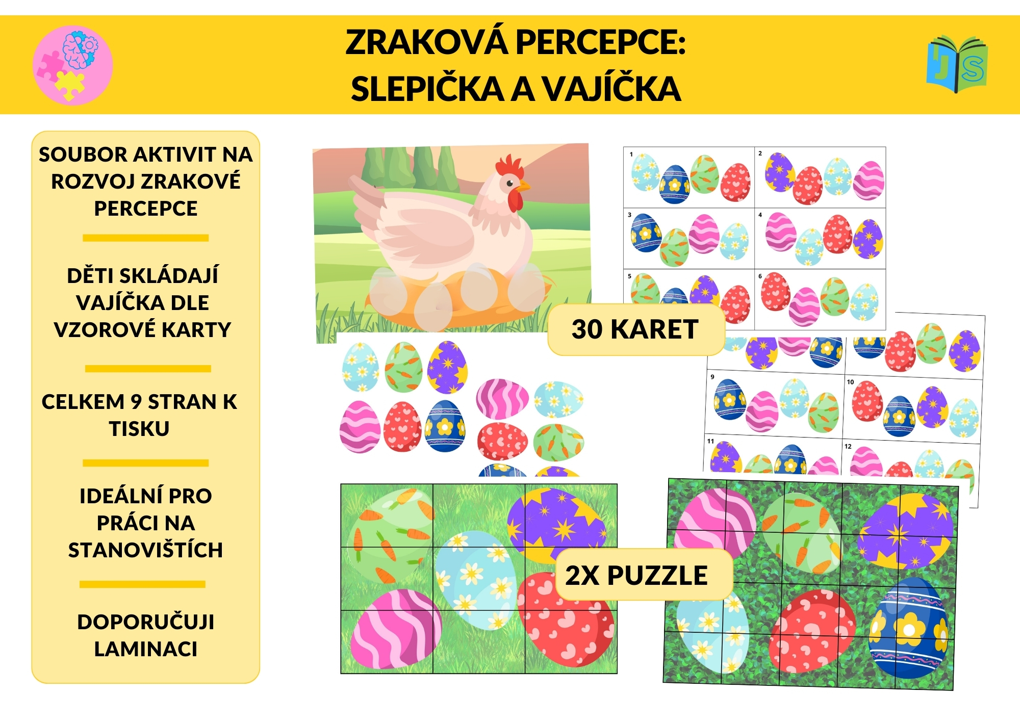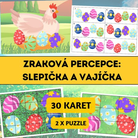 Součástí materiálu jsou také 2 malé puzzle s motivem vajíček, které dále rozvíjejí zrakovou diferenciaci a orientaci v prostoru.
