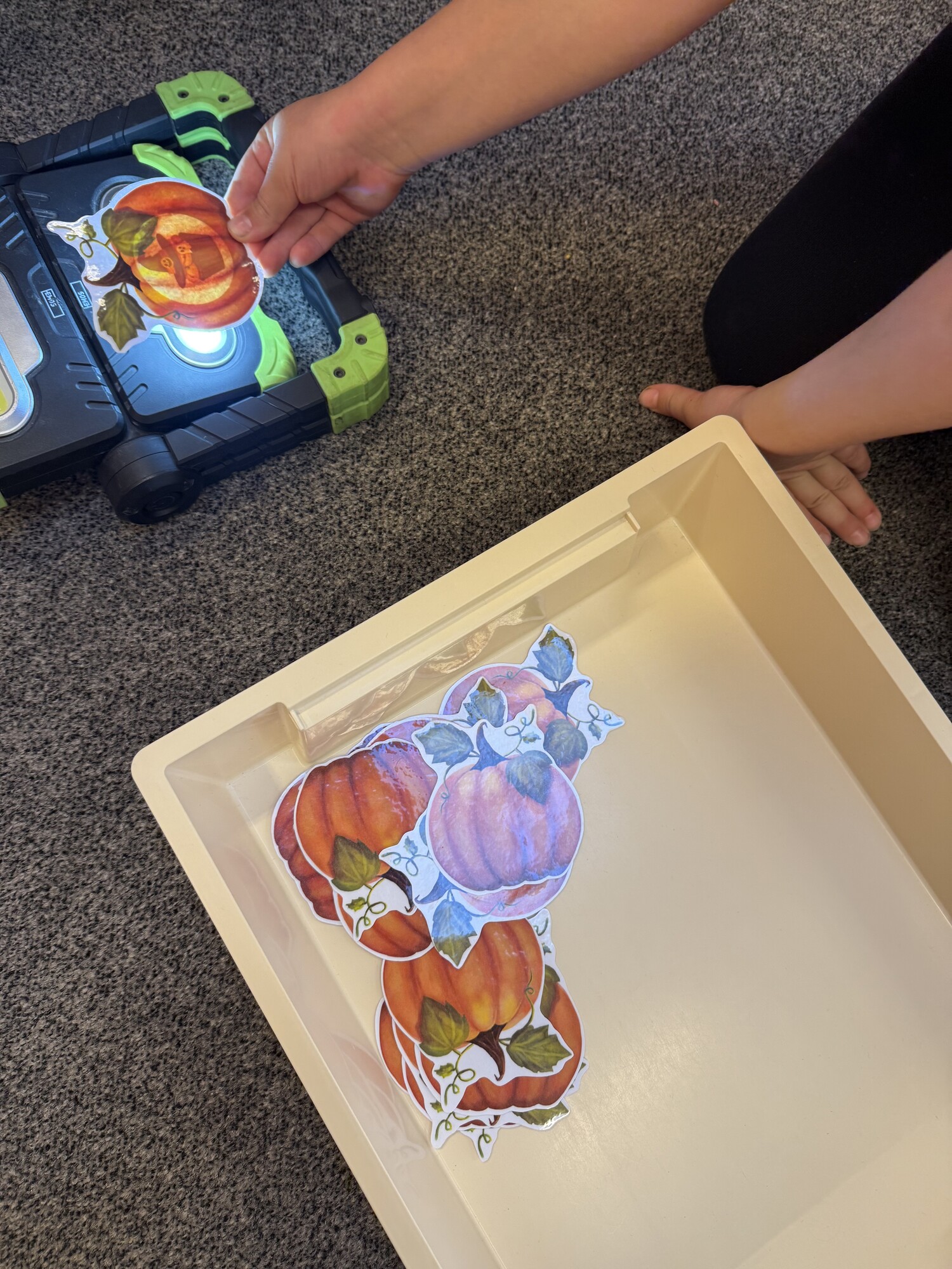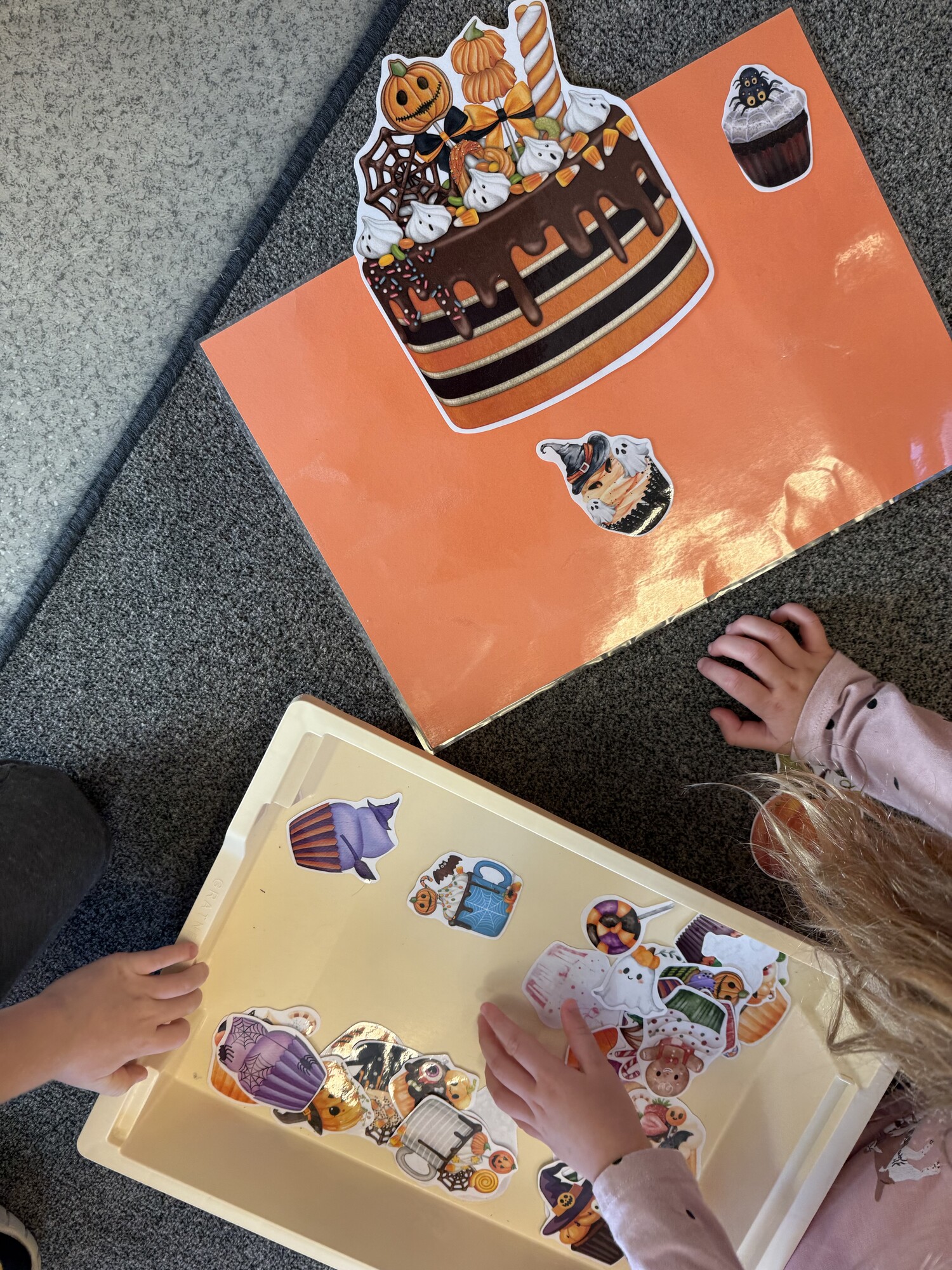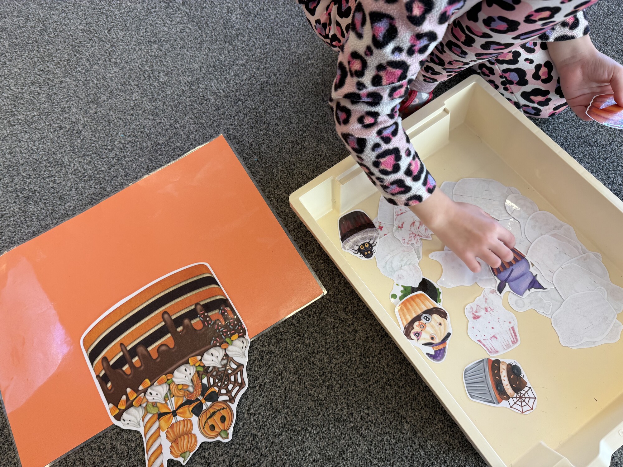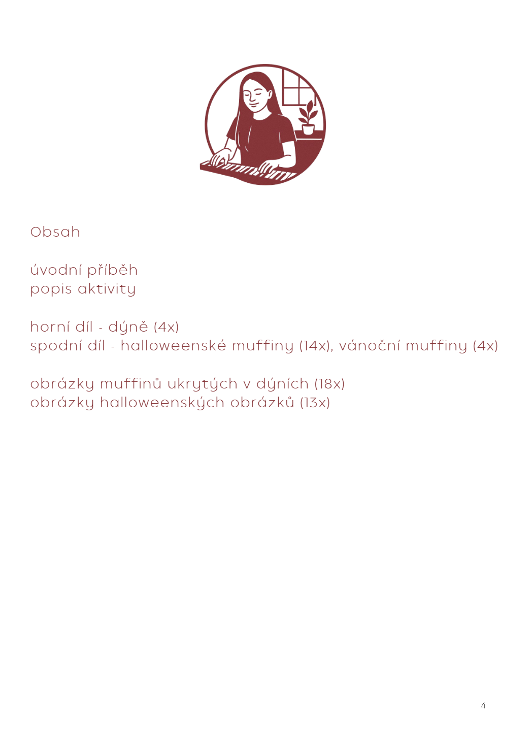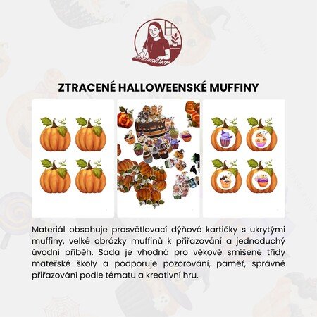 Materiál je určen pro věkově smíšené třídy a rozvíjí dětskou představivost prostřednictvím hry, při níž děti objevují ukryté obrázky, třídí je podle tématu a hledají správné muffiny k halloweenskému dortu. Součástí materiálu je krátký úvodní příběh o cukrářce, které se rozsypaly muffiny určené na halloweenskou oslavu. Také zde najdete jednoduchý popis hry. Děti pomocí baterky prosvěcují dýňové kartičky, objevují ukryté muffiny a snaží se najít ty správné, které patří k halloweenskému dortu.