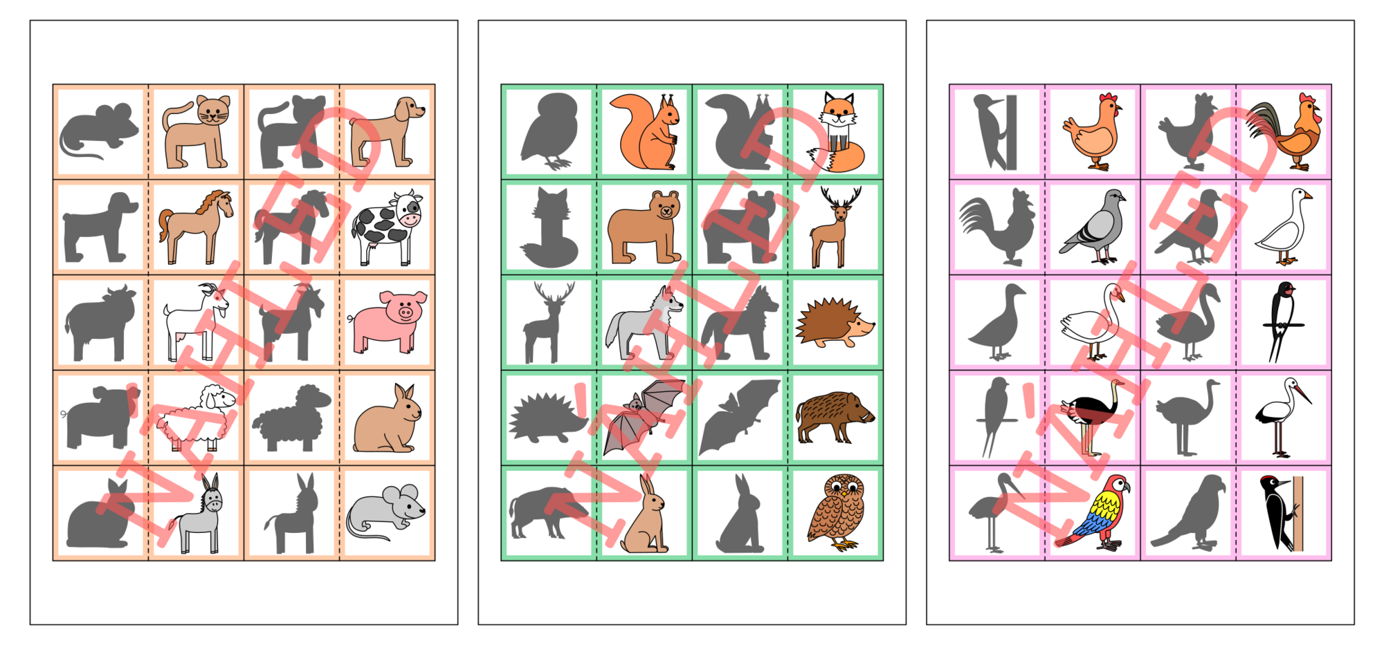 Materiál obsahuje šest stran s kartičkami domina (1 strana = 1 sada kartiček domina = 10 kartiček) a šest stran s kartičkami pexesa (60 dvojic). Tématem jsou zvířata.
