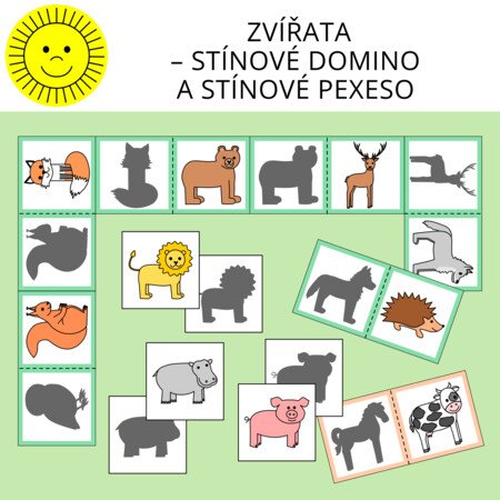 PEXESO: Hra je určena pro nejméně dvě děti. Kartičky leží obrázkem dolů. Děti střídavě otáčejí po dvou kartičkách. Pokud na kartičkách, které dítě otočí, je obrázek a jeho stín, vezme si tyto kartičky. Pokud tomu tak není, položí se kartičky zpět obrázkem dolů. Vyhrává ten, kdo najde nejvíce dvojic.