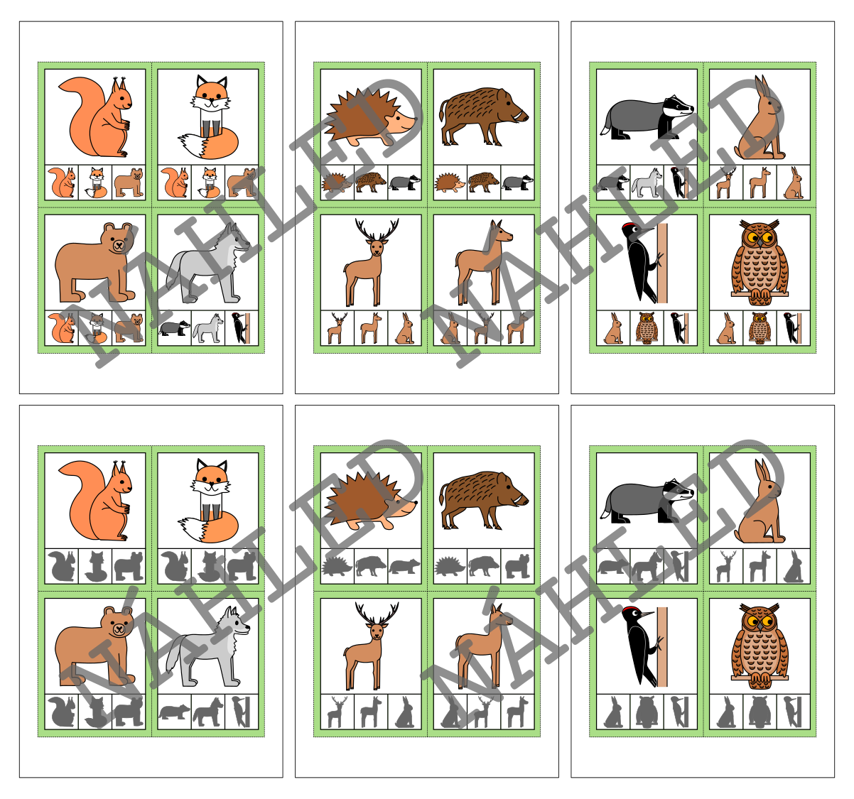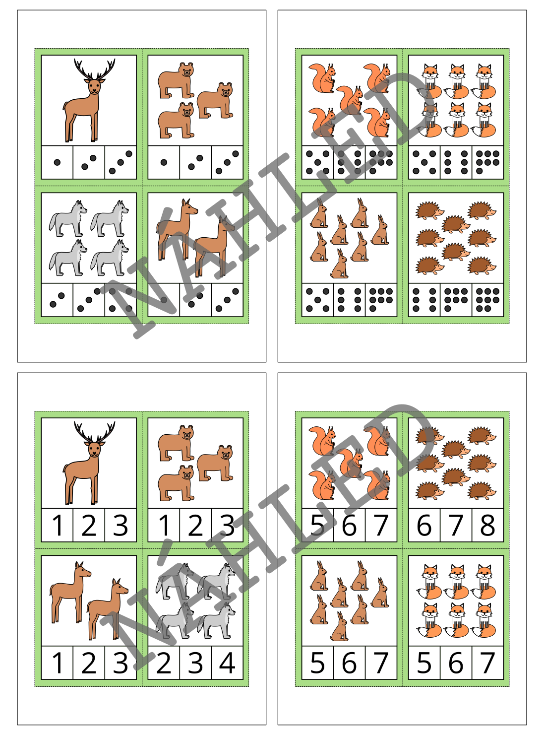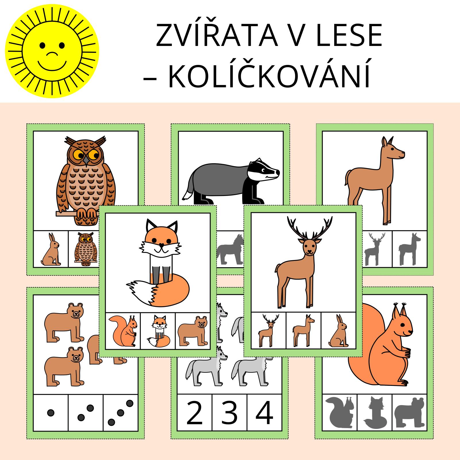 Materiál na téma zvířata v lese slouží k procvičení zrakového vnímání a počítání. Obsahuje 40 kartiček.