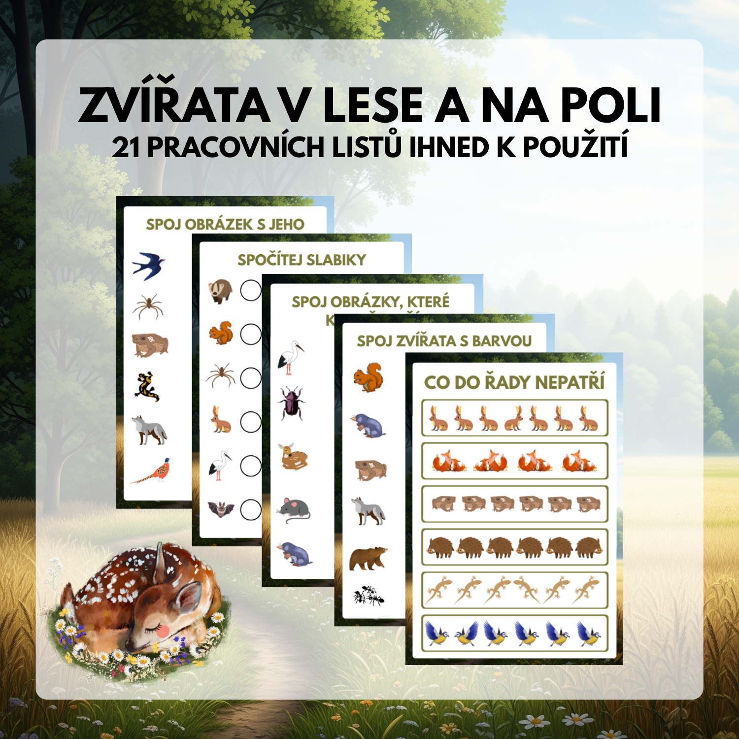 Materiál je zaměřen na zvířata v lese a na poli. Toto téma je dětem přiblíženo pomocí pracovních listů, které stačí pouze vytisknout a použít.