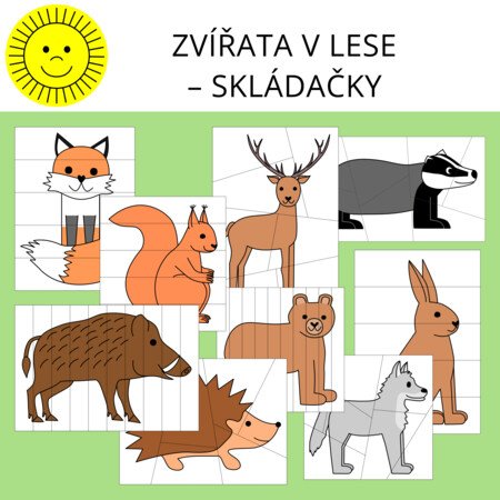 Materiál obsahuje skládačky devíti zvířat žijících v lese (liška, veverka, jelen, medvěd, vlk, divočák, jezevec, ježek, zajíc). Ke každému náhledovému obrázku jsou vytvořeny tři různě obtížné verze skládačky.