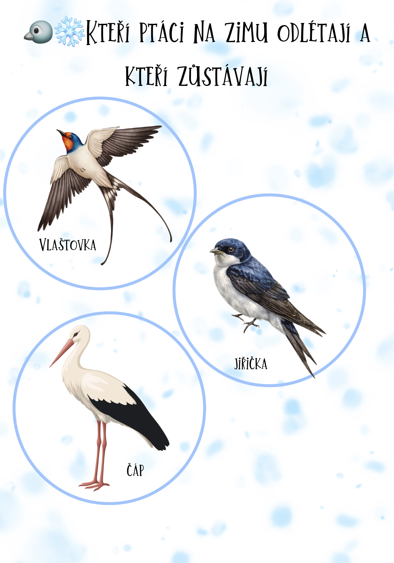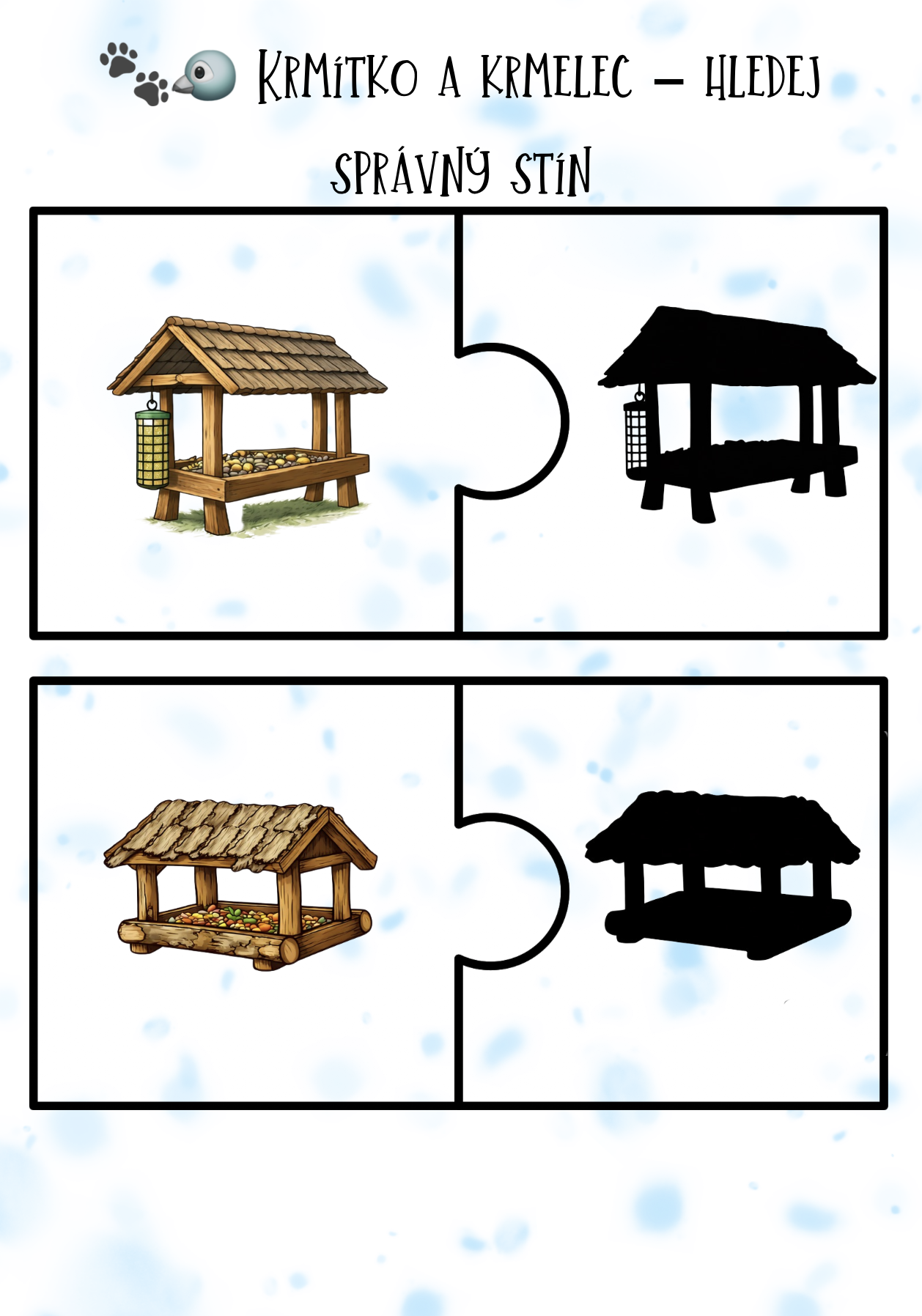 krmítko × krmelec (co kam patří / nepatří), hledání správného stínu, najdi dvě stejná krmítka, kdo v zimě spí a kdo je vzhůru, kde kdo v zimě spí, kteří ptáci odlétají a kteří zůstávají, obrázkové čtení, 8 tematických hádanek