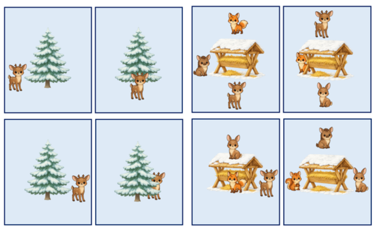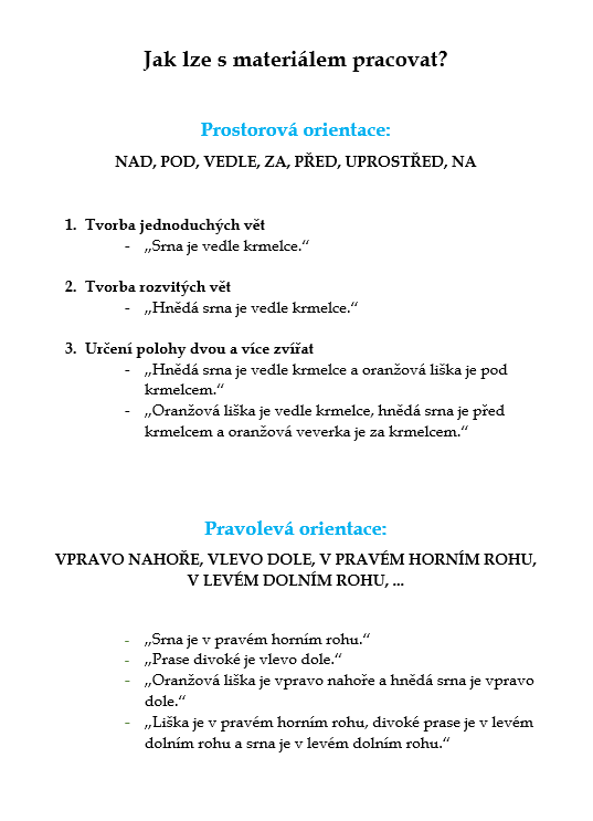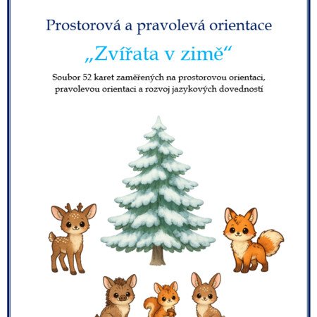 Tento výukový materiál obsahuje 52 karet, které jsou vhodné k procvičení prostorové orientace, pravolevé orientace a rozvoji jazykových dovedností v mateřské škole. Soubor obrázků je zimně naladěn, stačí jej vytisknout, zalaminovat a rozstříhat na jednotlivé karty. Součástí je i návod, jak lze s materiálem pracovat, a sada obrázků k vystřižení, pomocí nichž lze názorně ukázat, kde se zvíře nachází.