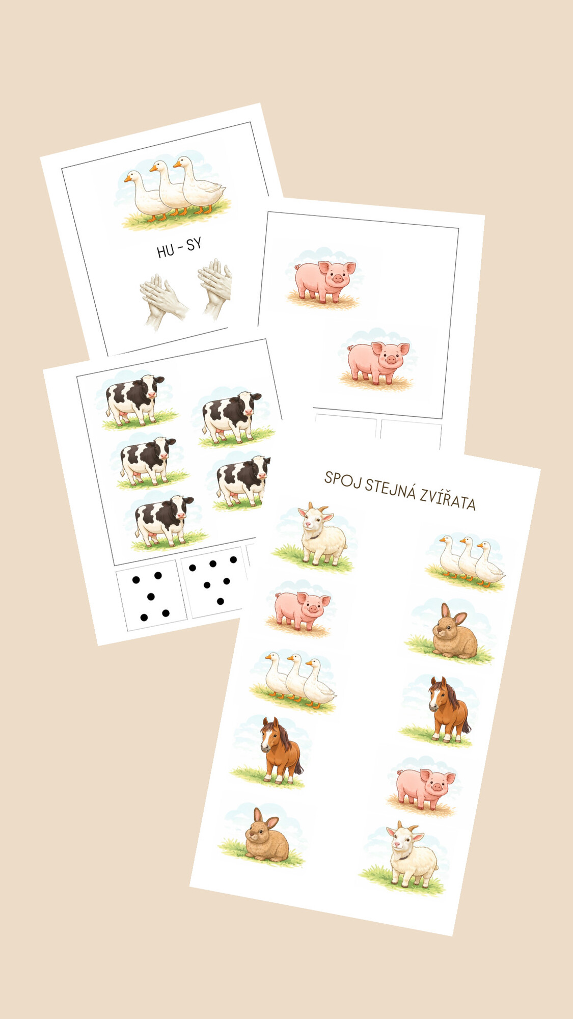 V souboru 2 pracovní listy na spojování obrázků, které k sobě patří. Dále výukové kartičky pěti zvířat na vytleskávání slabik. A nakonec kolíčkování jak pro předškolní děti, tak i pro menší (od každé varianty 8).