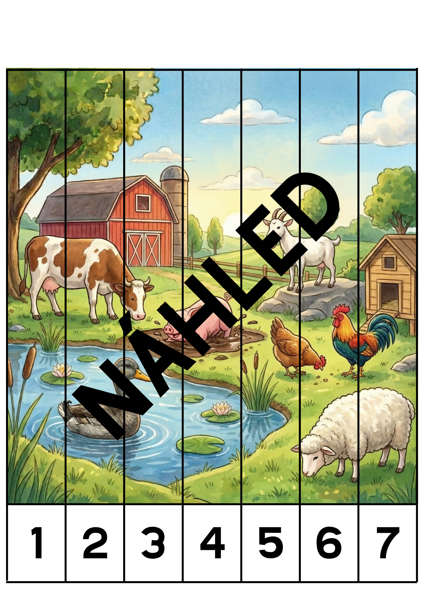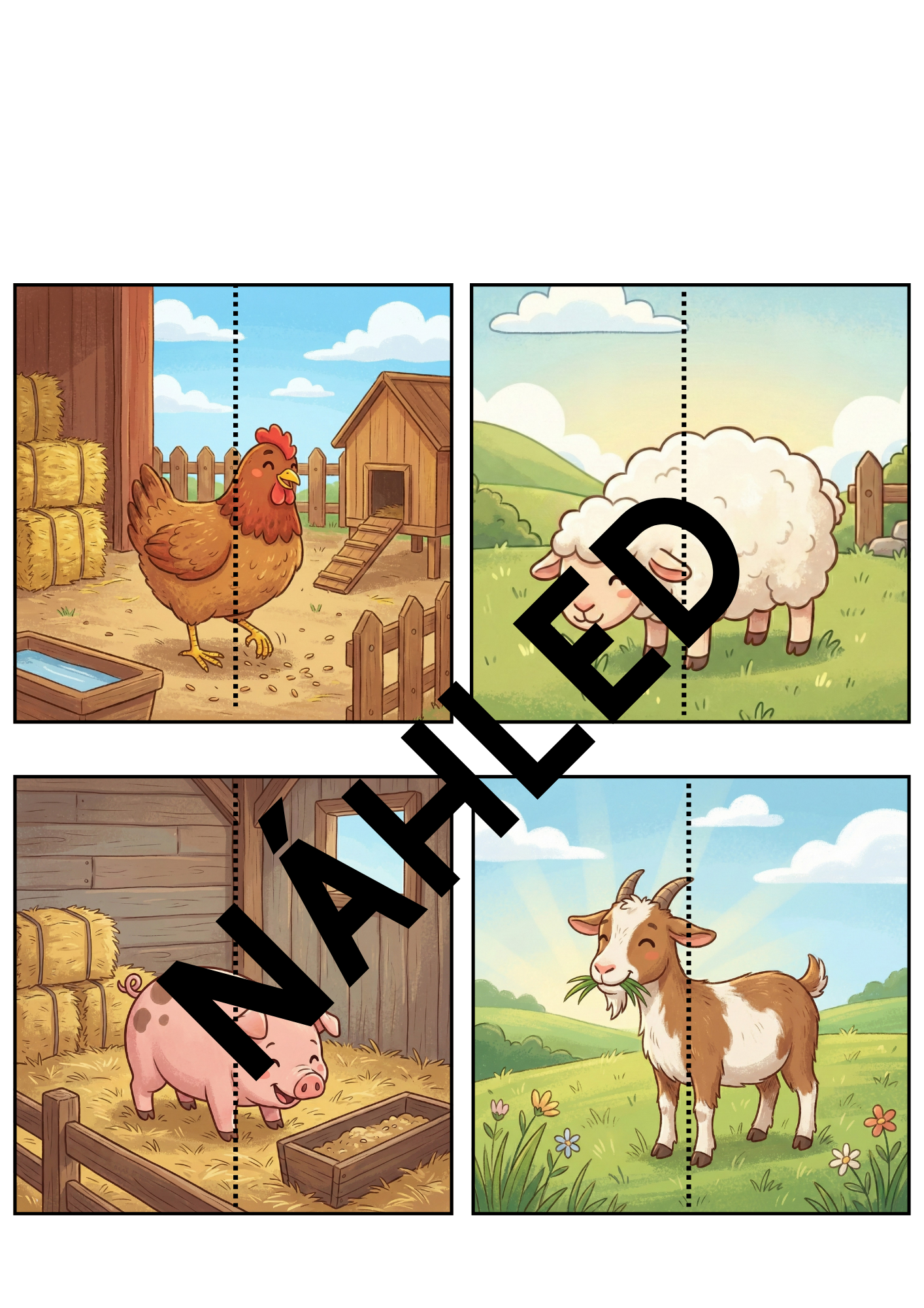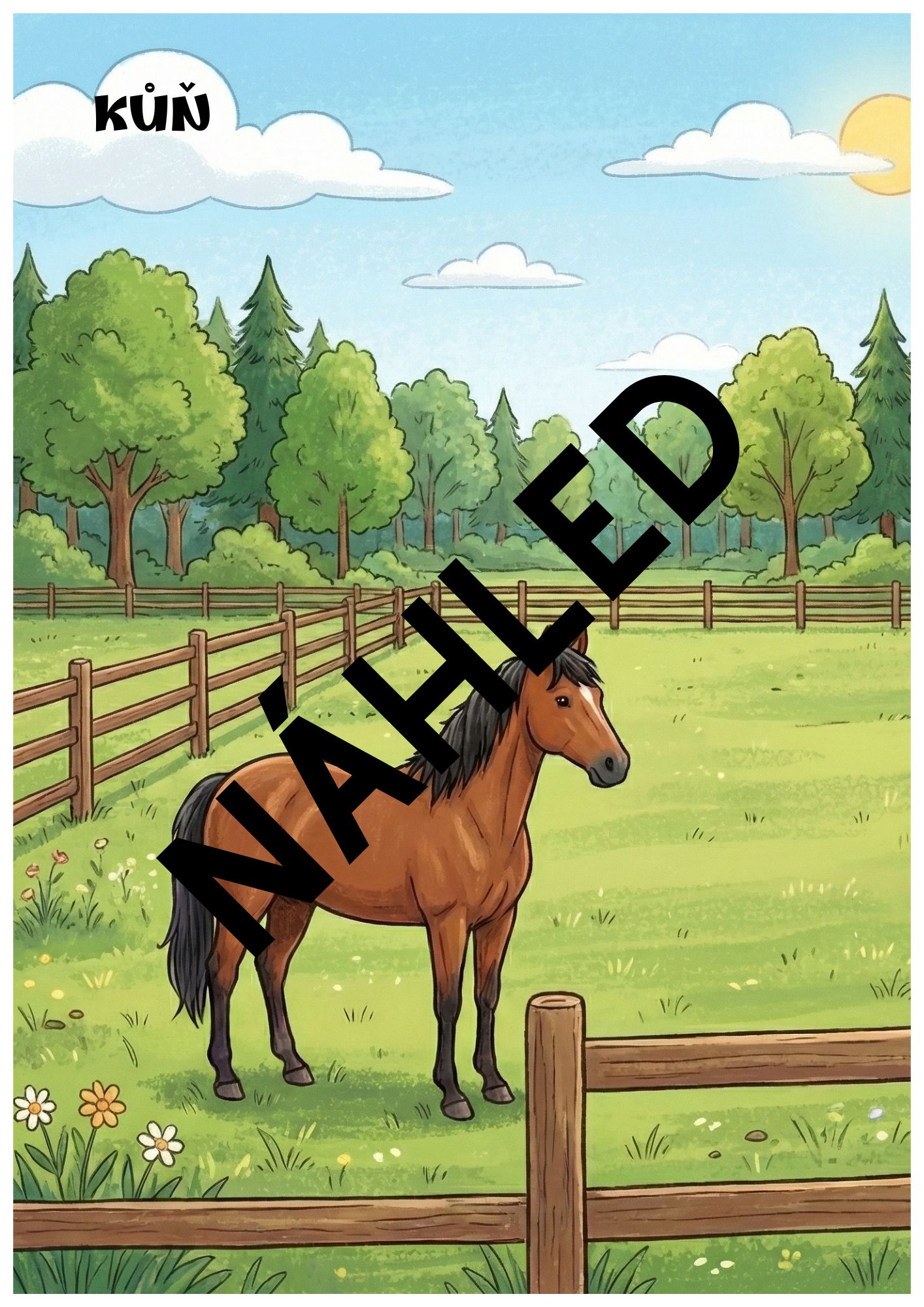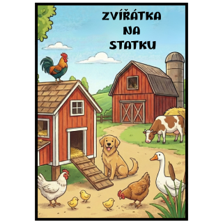 - 12 demonstračních obrázků zvířat, která žijí na statku (kočka, pes, husa, slepice, holub, kachna, králík, ovce, prase, koza, kráva, kůň), formát A4