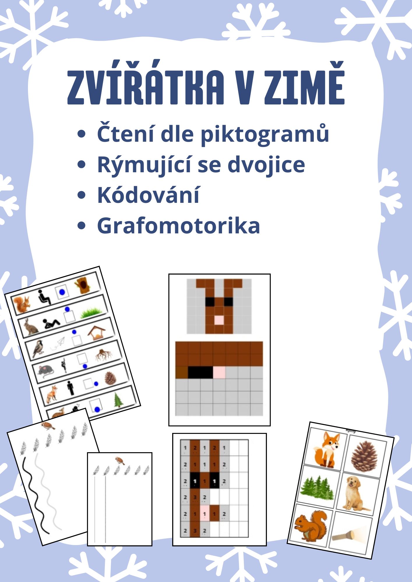 Zvířátka v ziměSoubor obsahuje:10 kartiček ke čtení dle piktogramů6 dvojic rýmů k podtématu3 obrázky základů kódování Grafomotorické pracovní listy (čára, zuby, vlnka, čisté- pro zvolení vlastního prvku)