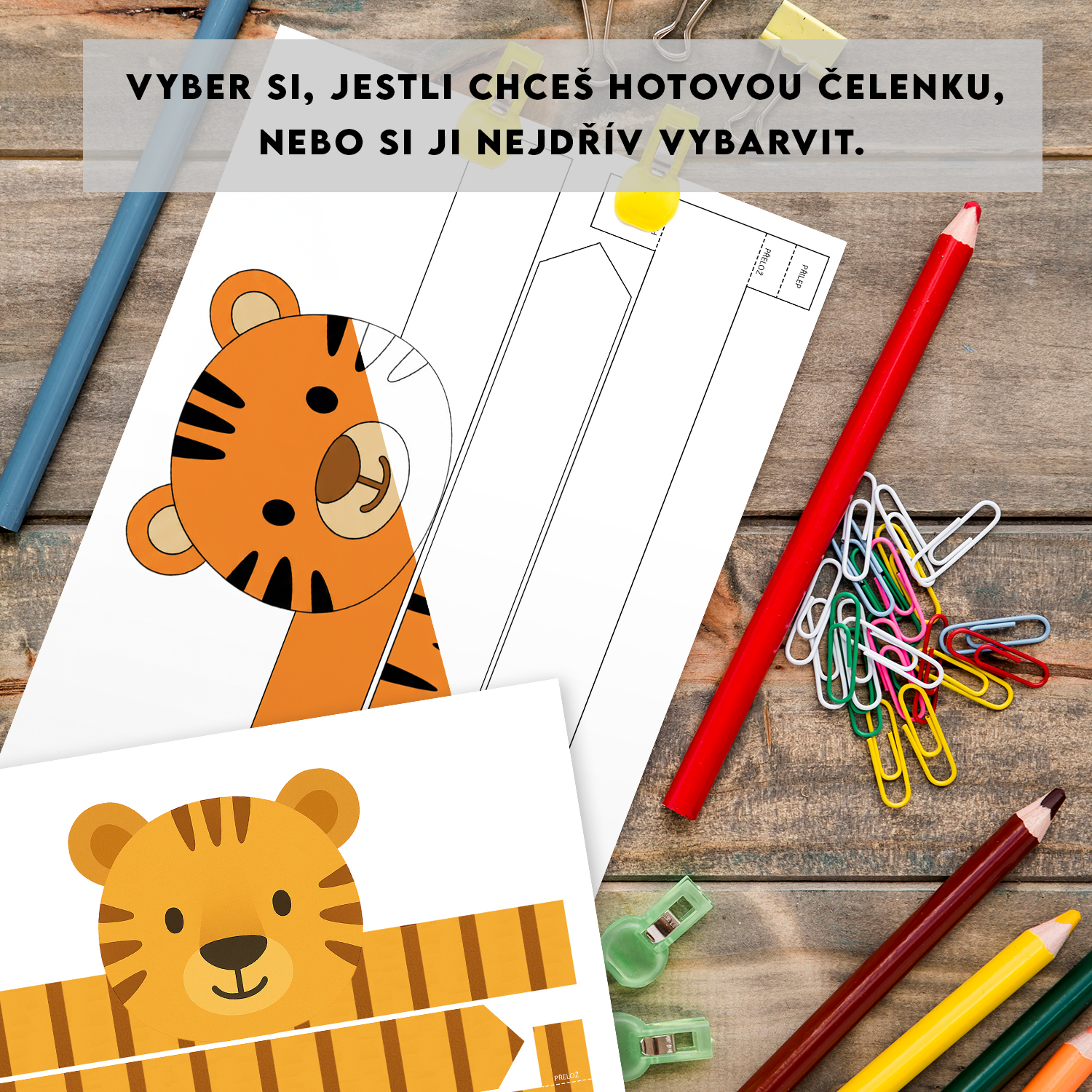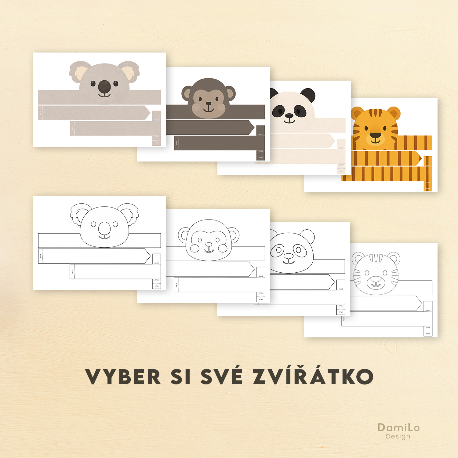 (tygr, panda, opice, koala) - 4 černobílé verze čelenek určené k vybarvení