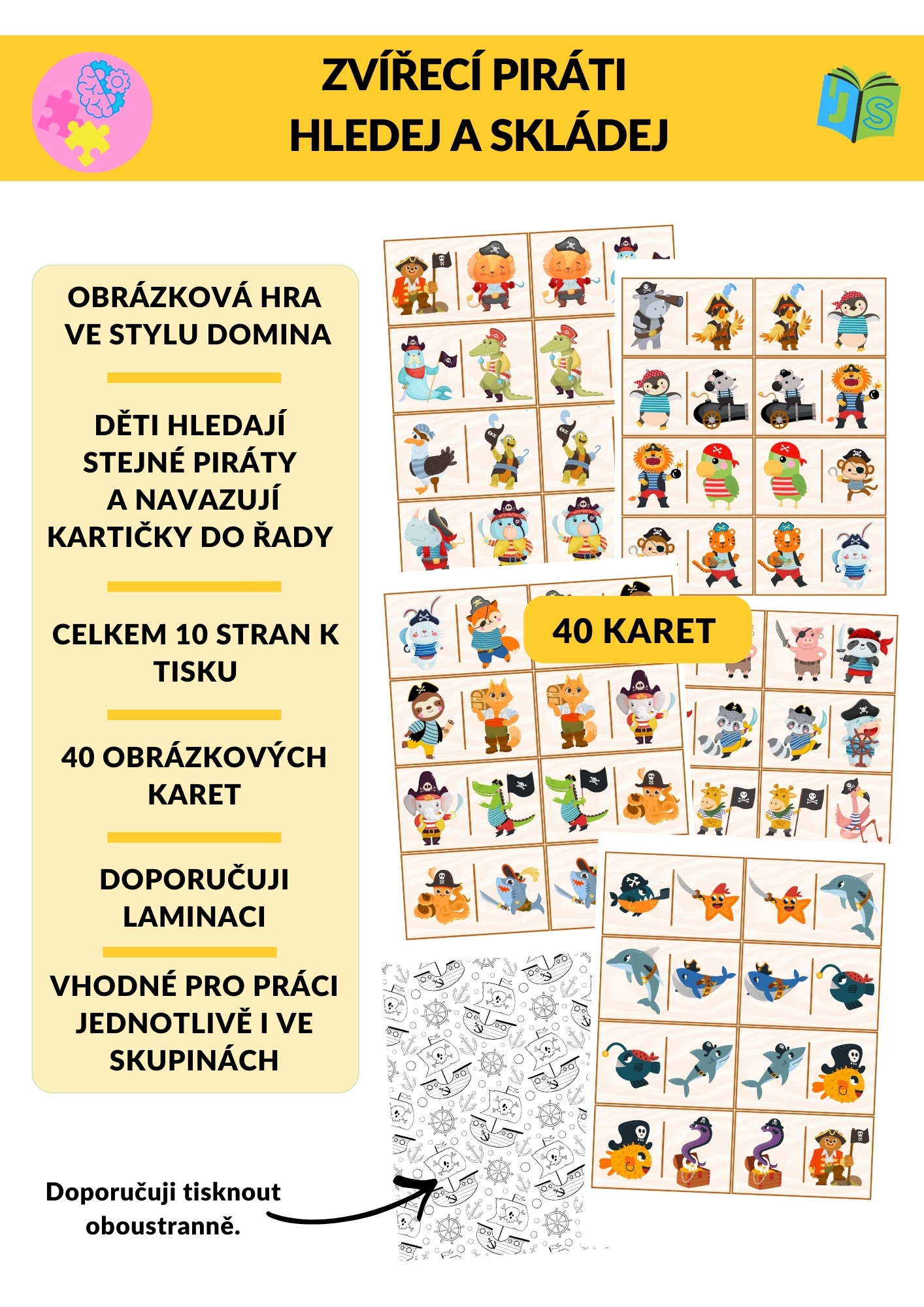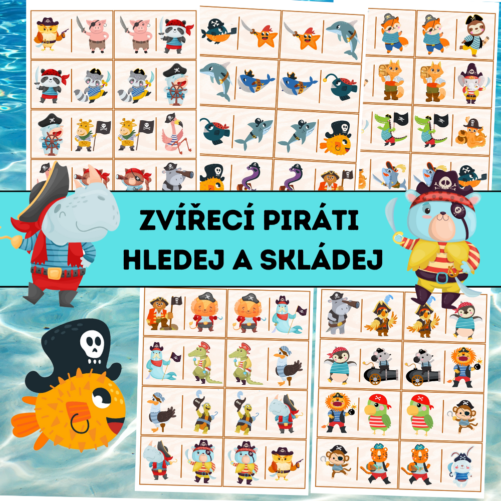 Zvířecí piráti – hledej a skládej je obrázková hra ve stylu domina zaměřená na rozvoj zrakové percepce, pozornosti a schopnosti porovnávání. Děti vyhledávají stejné obrázky zvířecích pirátů a navazují kartičky do řady tak, aby na sebe správně navazovaly.