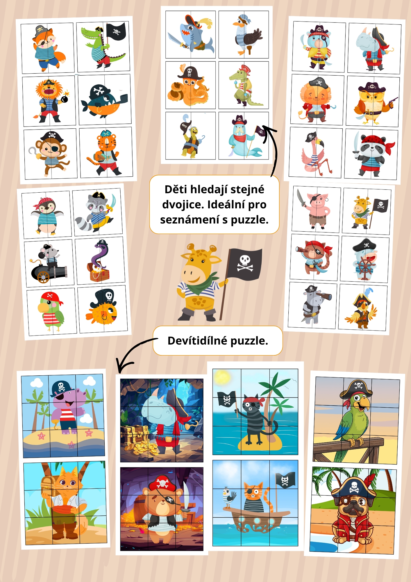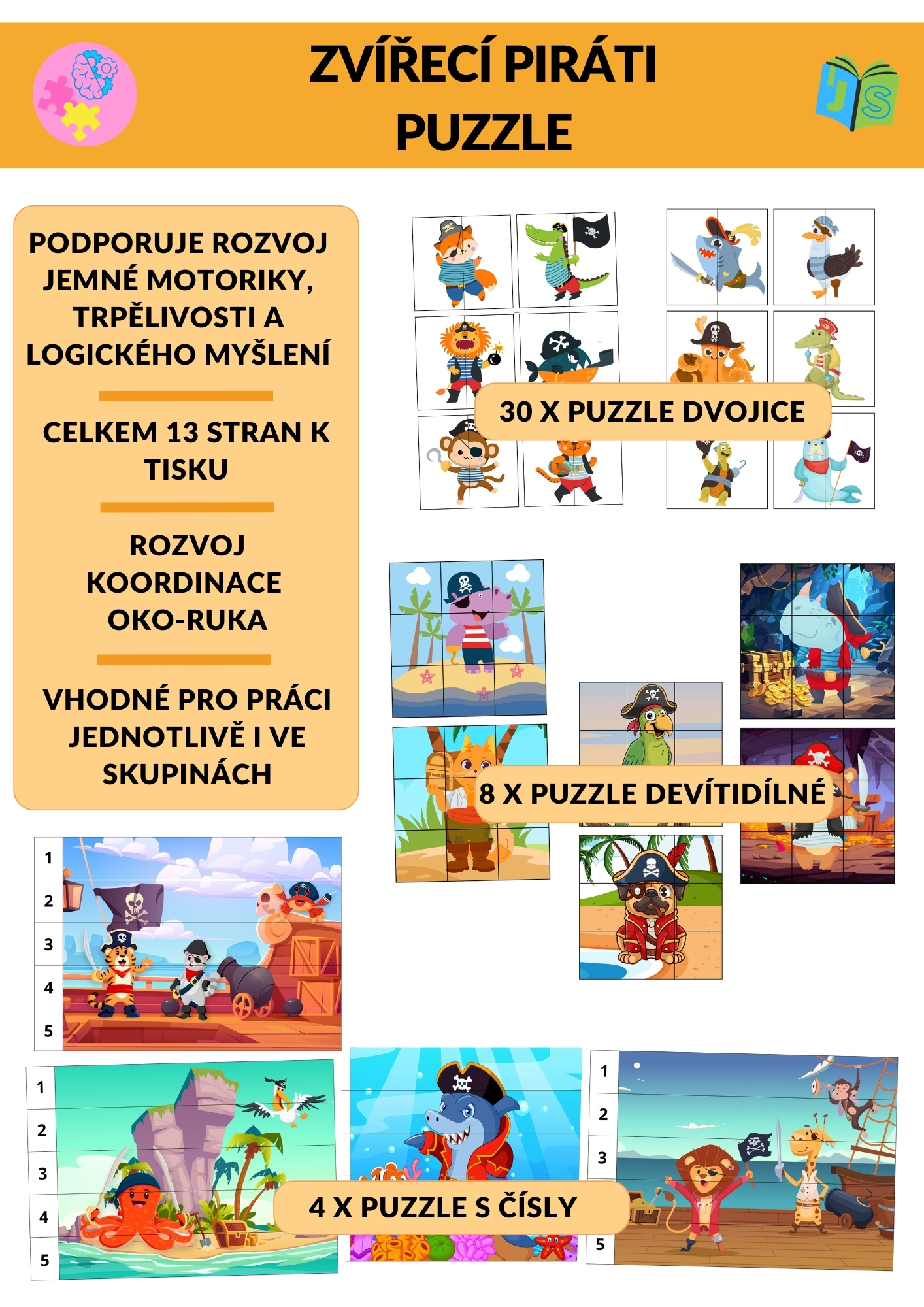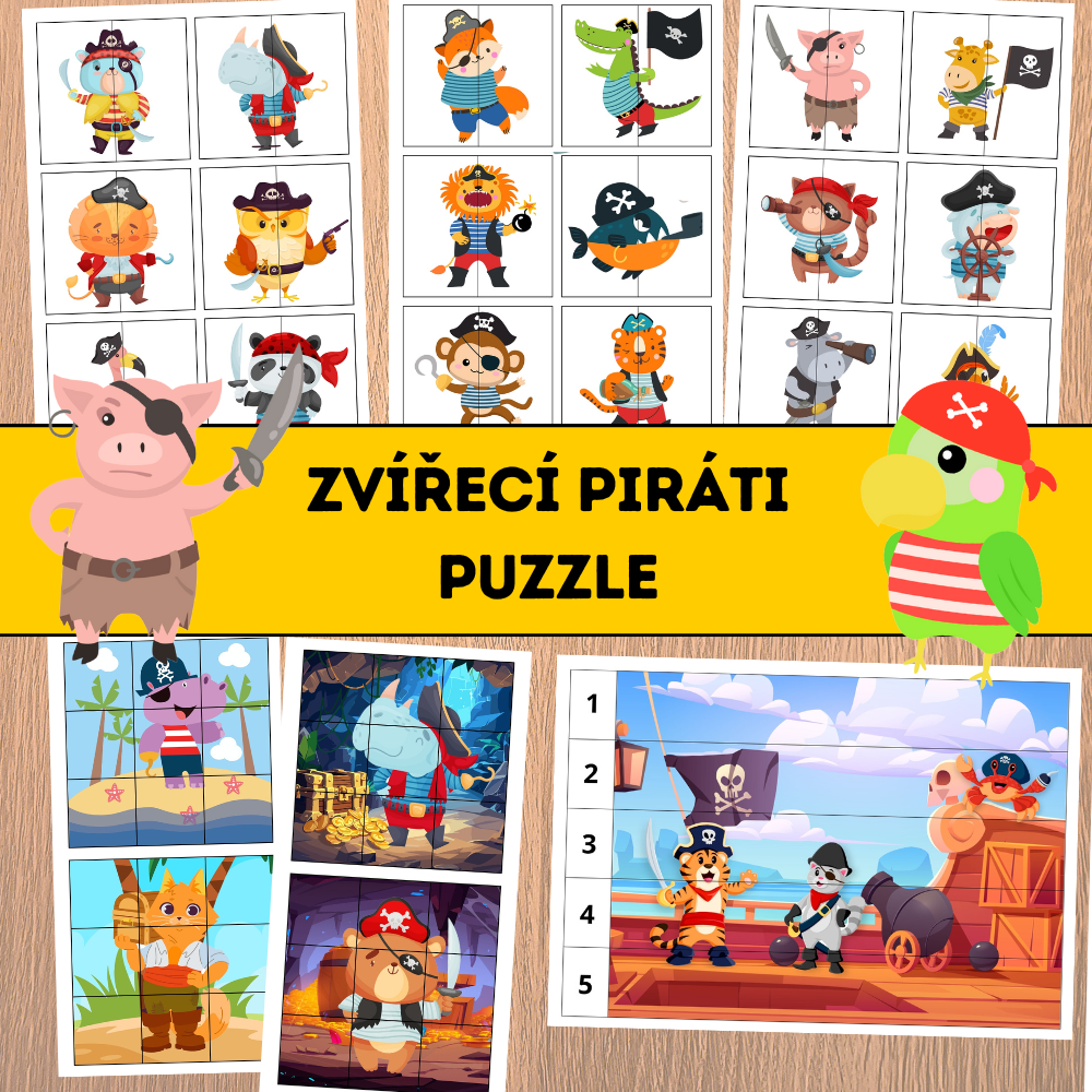 Zvířecí piráti – puzzle je hravý vzdělávací materiál zaměřený na rozvoj zrakového vnímání, logického myšlení a jemné motoriky. Děti pracují s obrázky zvířecích pirátů a postupně skládají puzzle různých obtížností – od jednoduchého párování až po skládání obrázků podle číselné posloupnosti.