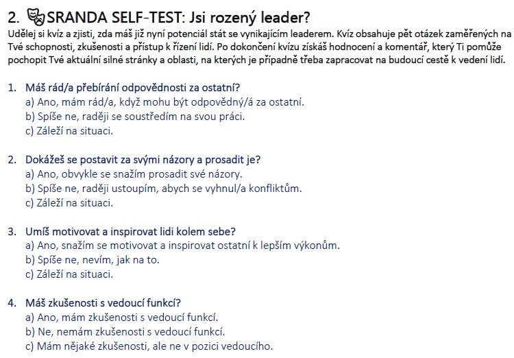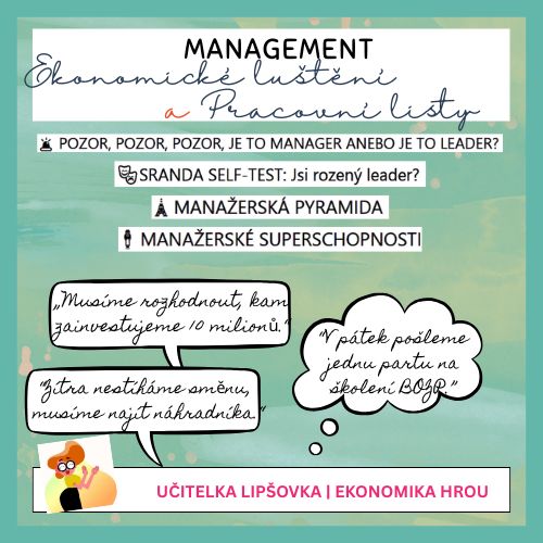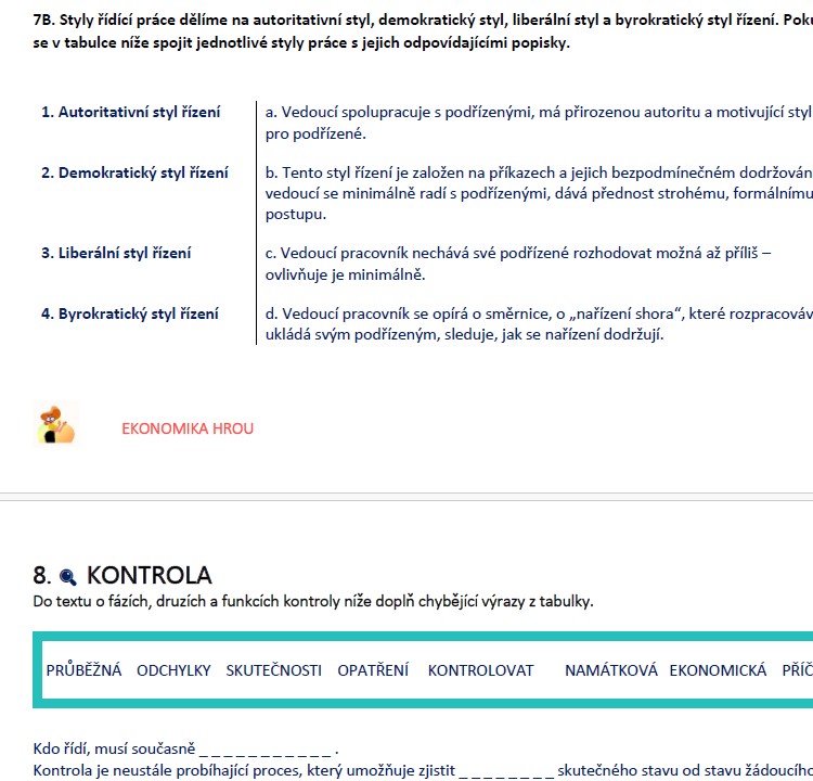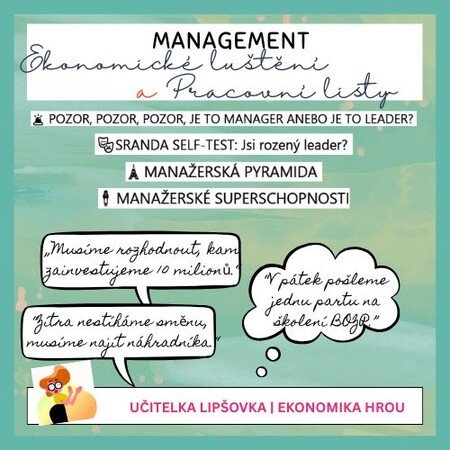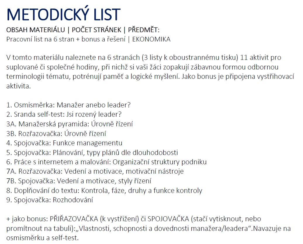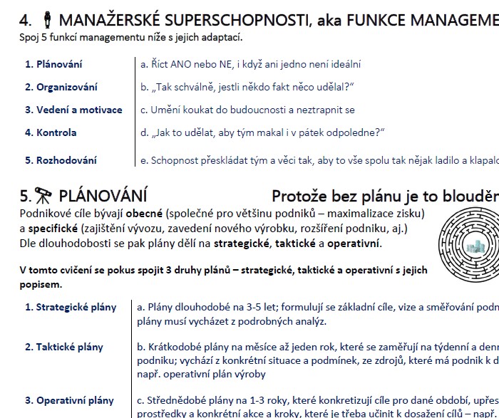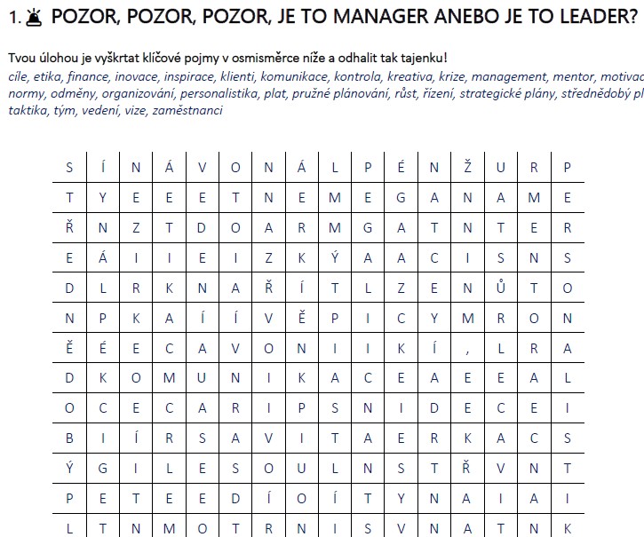 + jako bonus: PŘIŘAZOVAČKA (k vystřižení) či SPOJOVAČKA (stačí vytisknout, nebo promítnout na tabuli):„Vlastnosti, schopnosti a dovednosti manažera/leadera“. Navazuje na osmisměrku a self-test.