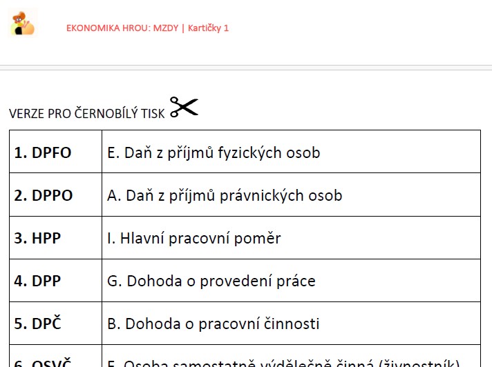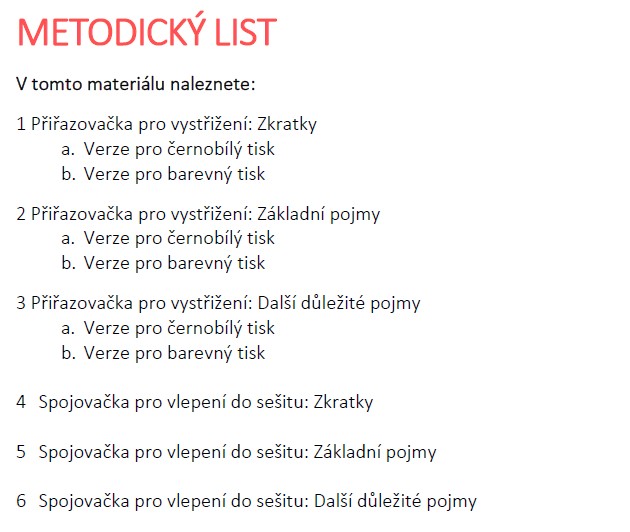 - Přiřazovačky k vystřižení (zkratky, základní pojmy, další důležité pojmy) – vždy ve dvou verzích: černobílé pro úsporu tisku a barevné pro atraktivní práci.