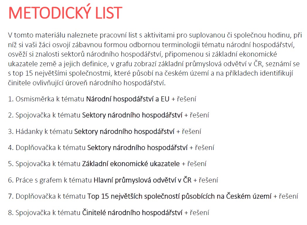 V tomto materiálu naleznete 4 strany aktivit v pracovní listu pro suplovanou či společnou hodinu k tématu národní hospodářství.