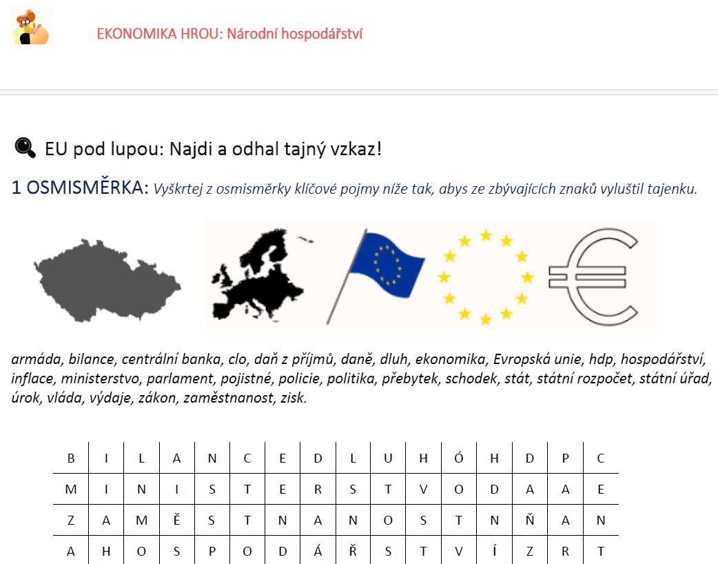 1. Osmisměrka k tématu Národní hospodářství a EU + řešení + bonus