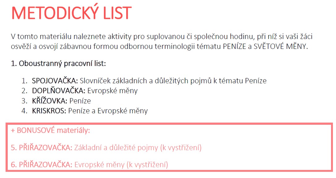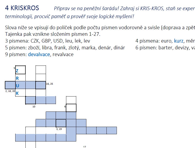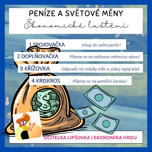 V tomto materiálu naleznete aktivity pro suplovanou či společnou hodinu, při níž si vaši žáci osvěží a osvojí zábavnou formou odbornou terminologii tématu PENÍZE a SVĚTOVÉ MĚNY.