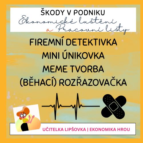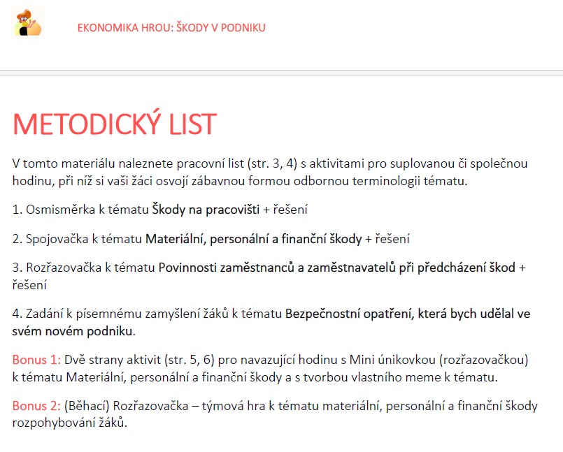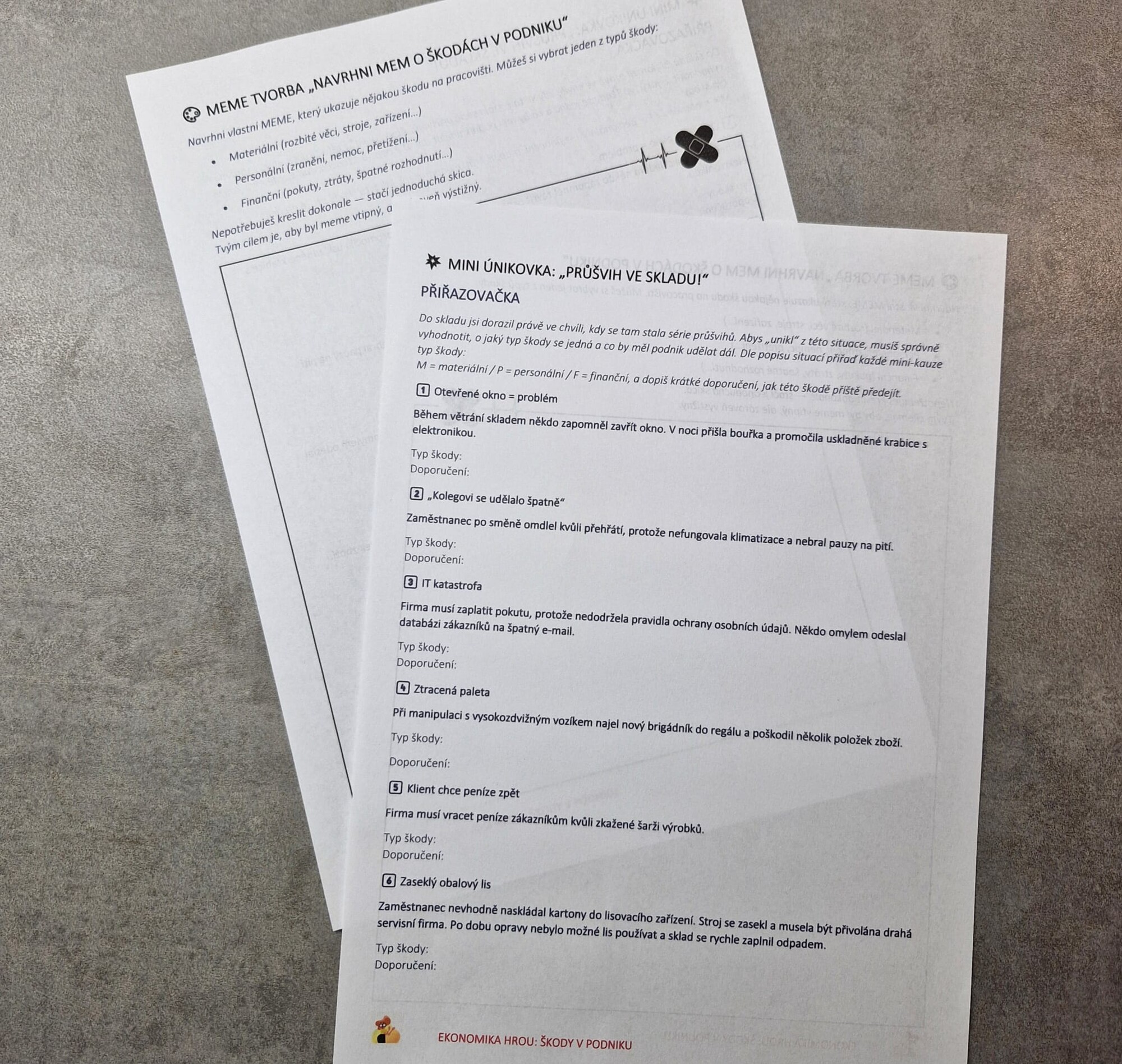 Bonus 1: Dvě strany aktivit (str. 5, 6) pro navazující hodinu s Mini únikovkou (rozřazovačkou) k tématu Materiální, personální a finanční škody a tvorbou vlastního meme k tématu.