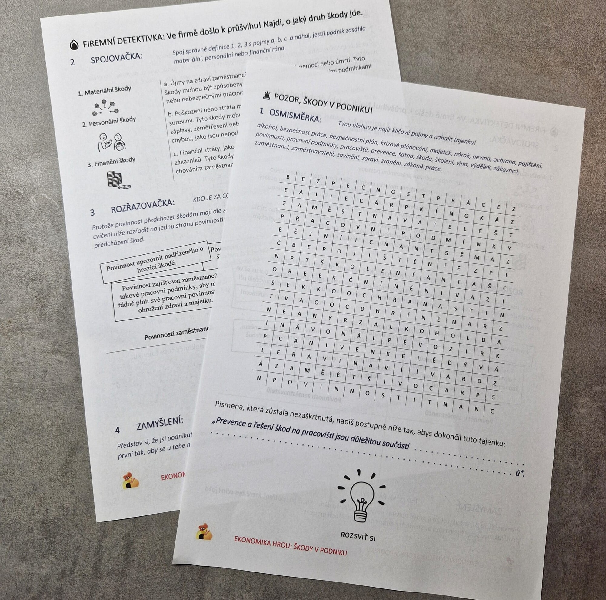 Jedná se o oboustranný pracovní list s osmisměrkou, spojovačkou, rozřazovačkou a zamyšlením k tématu Druhy škod v podniku a předcházení škodám k předmětu Ekonomika.